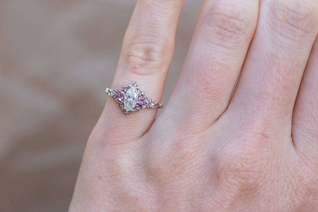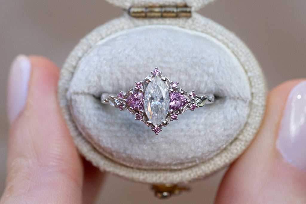 -Side/Accents: 3mm trillion lab pink sapphire, 1mm pink sapphire