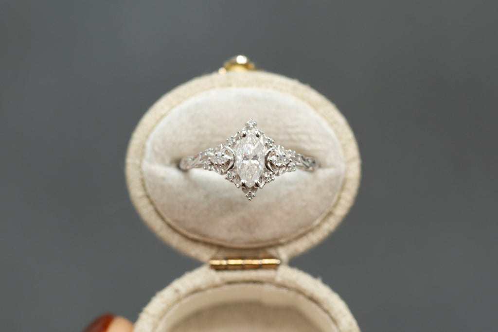 -Sides/Accents: 3x1.5mm marquise lab diamond, 1mm lab diamond
