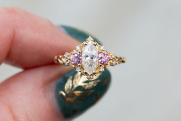 - Side/accent stones: 3mm trillion lab pink sapphire, 1mm lab diamond