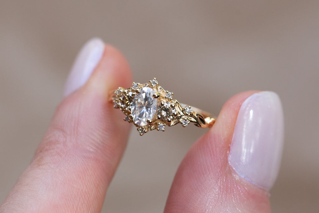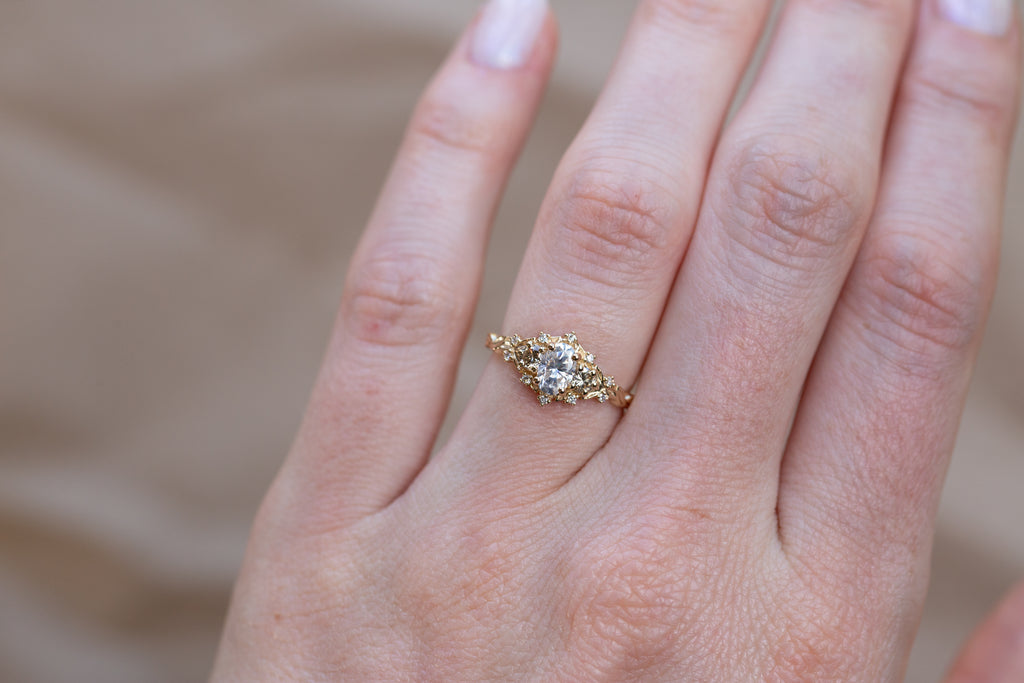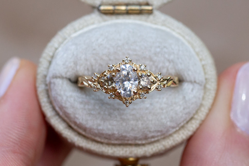 -Side/Accent stones: 3mm round champagne diamond, 1mm round lab diamond