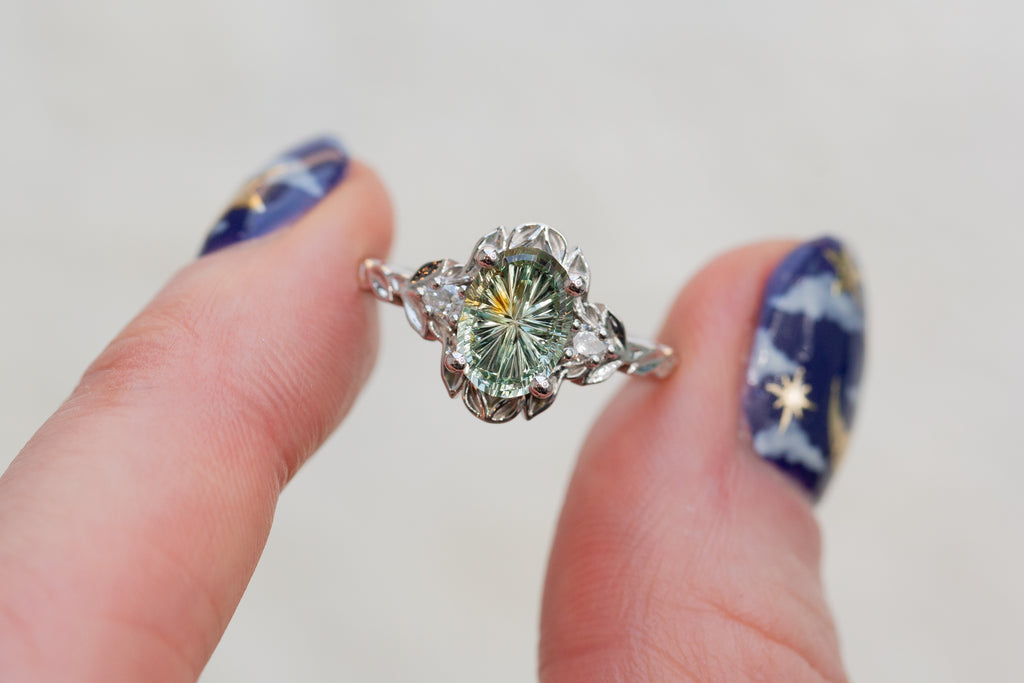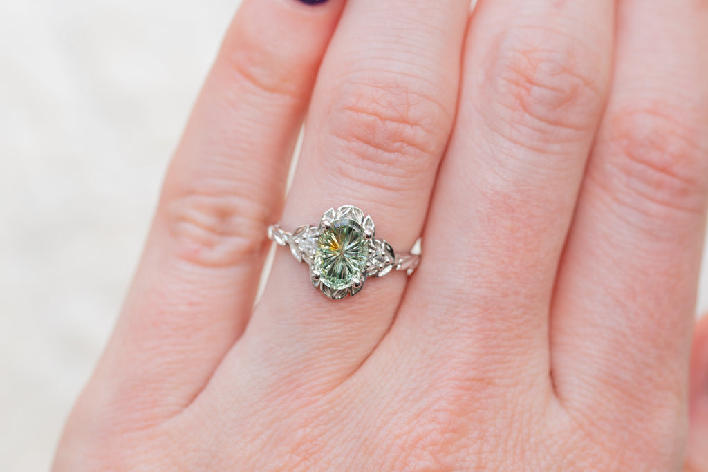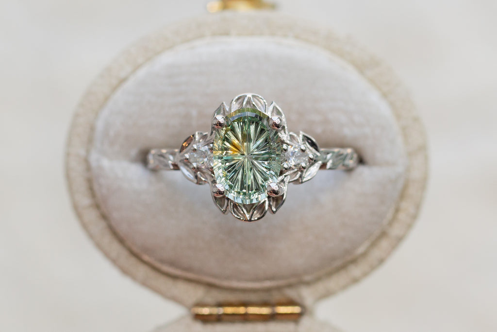 -Center stone: 1.99ct oval part Montana sapphire, Starbrite cut by John Dyer
