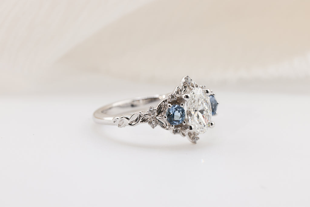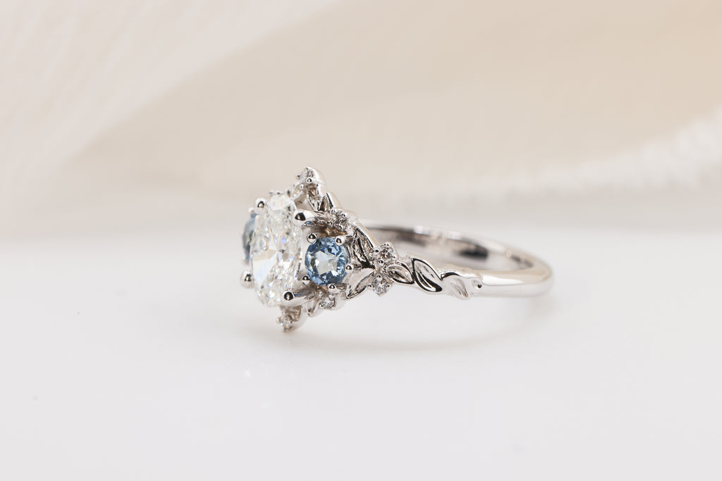 -Side/accent stones: 3mm round aquamarine, 1mm lab diamond