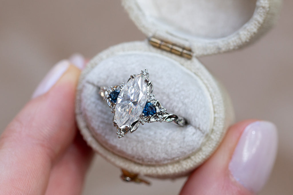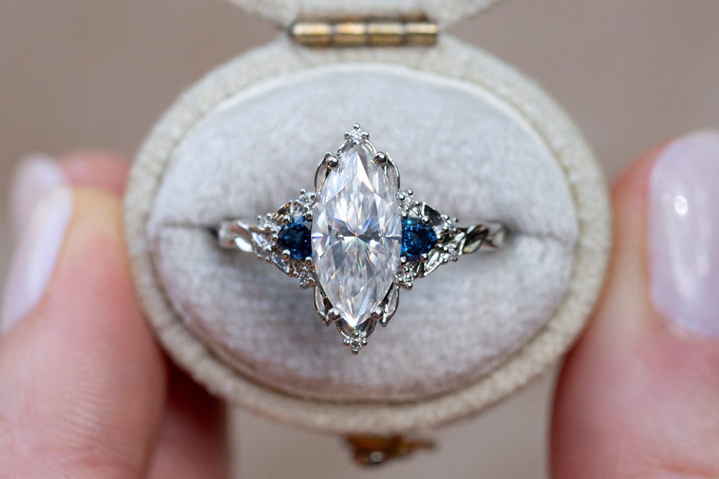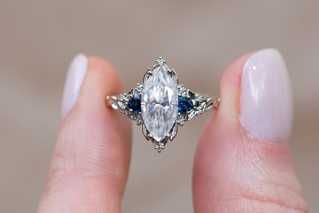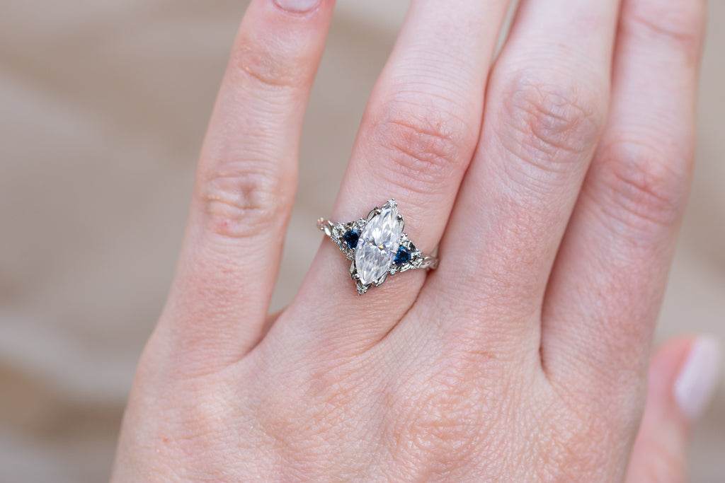 -Side/Accent stones: 3mm blue sapphire, 1mm round lab diamond