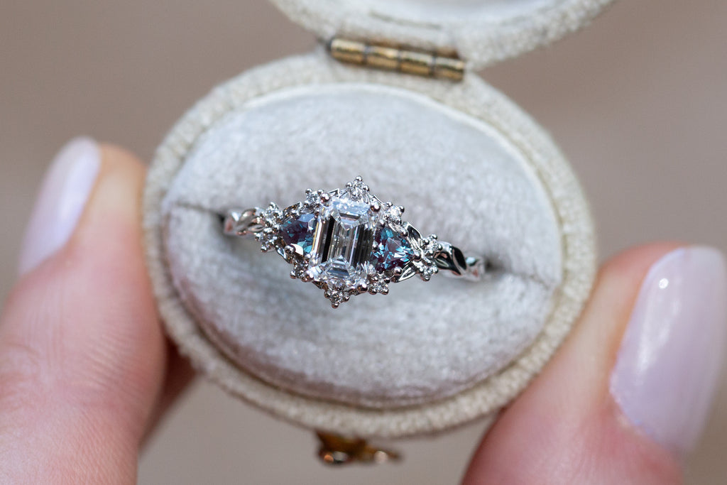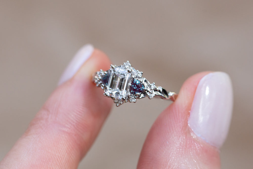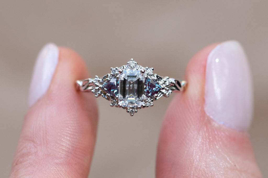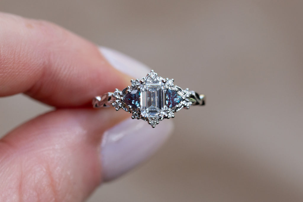 -Side/Accent stones: 3mm trillion lab alexandrite, 1mm round lab diamond