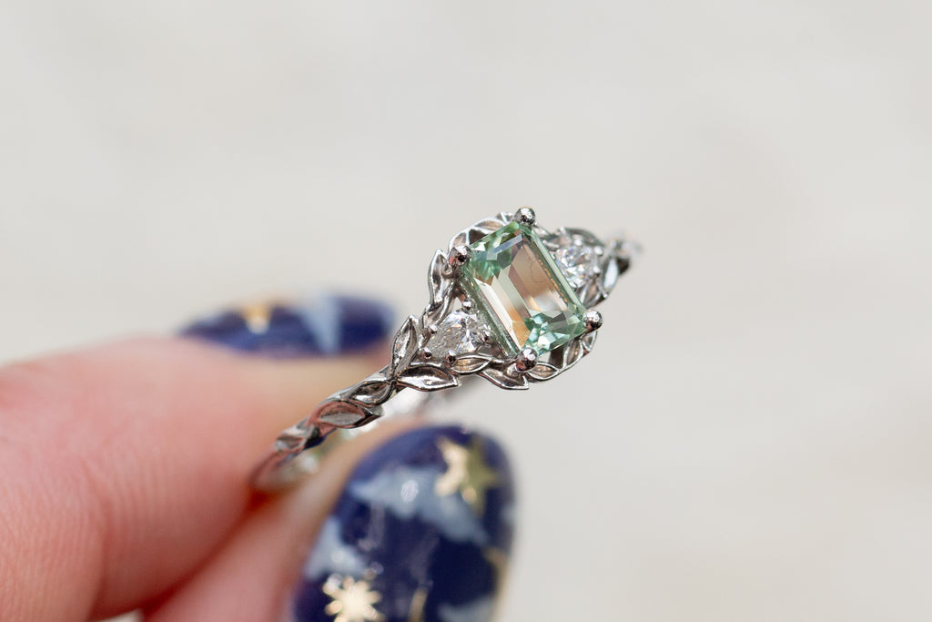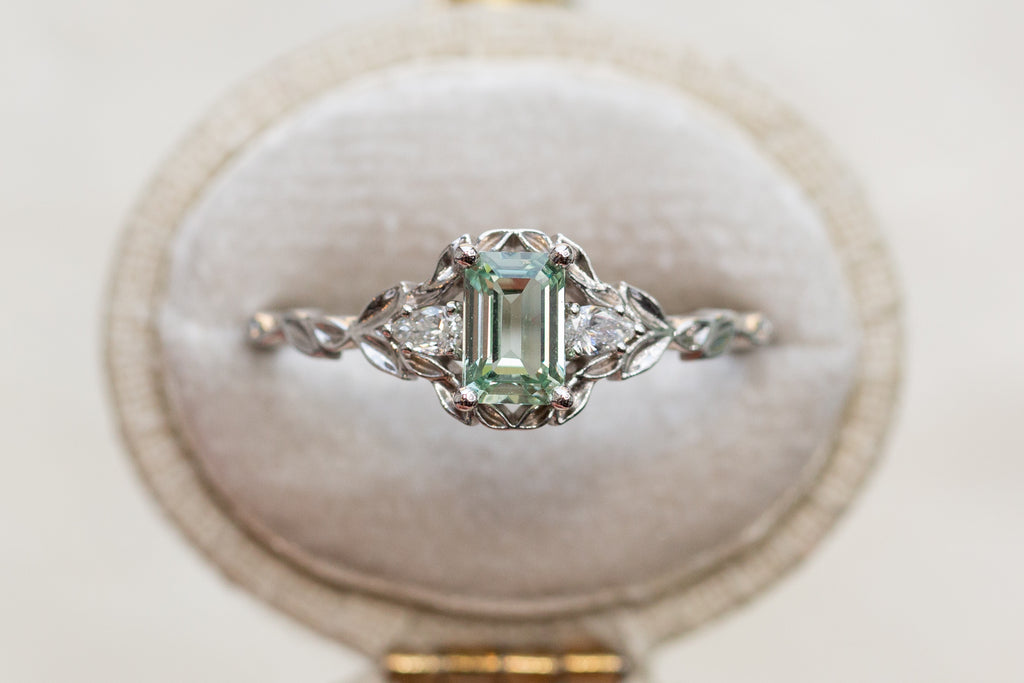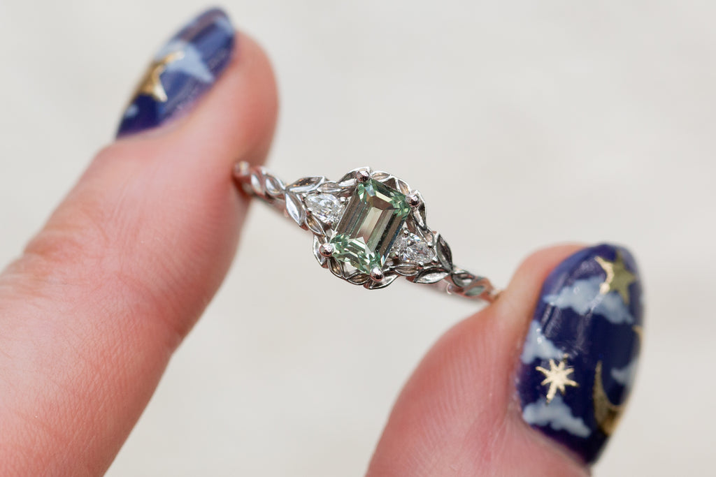 -Center stone: 6x4mm emerald cut lab green sapphire