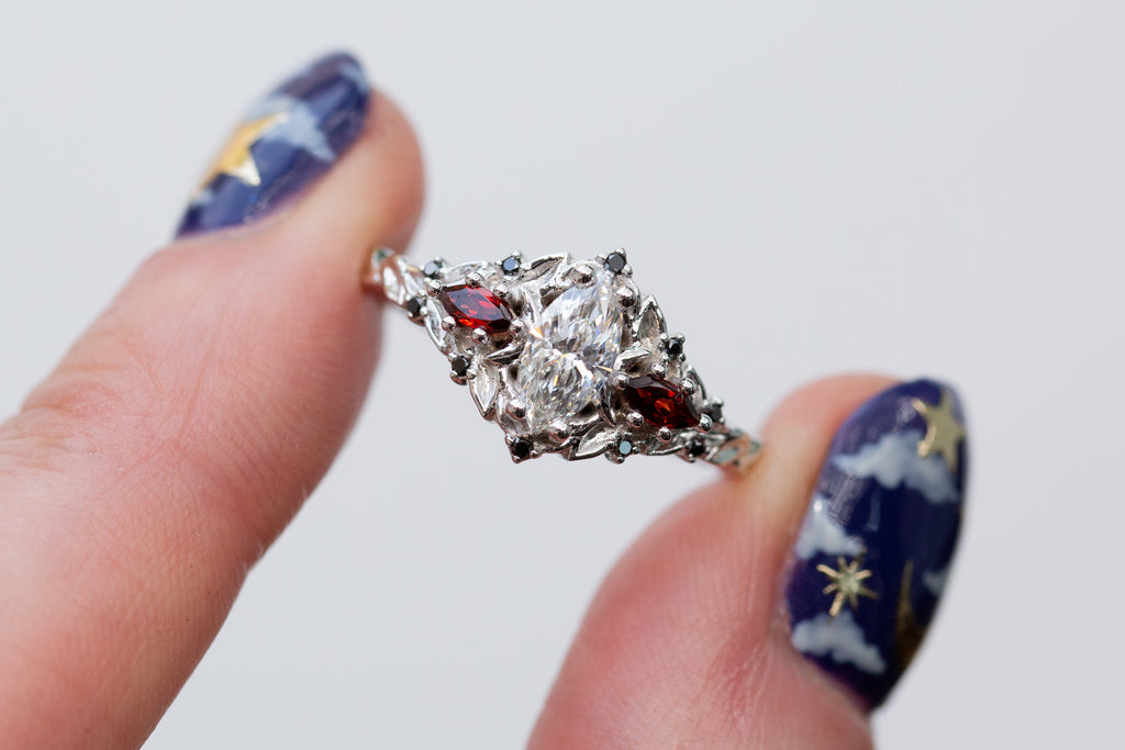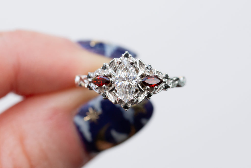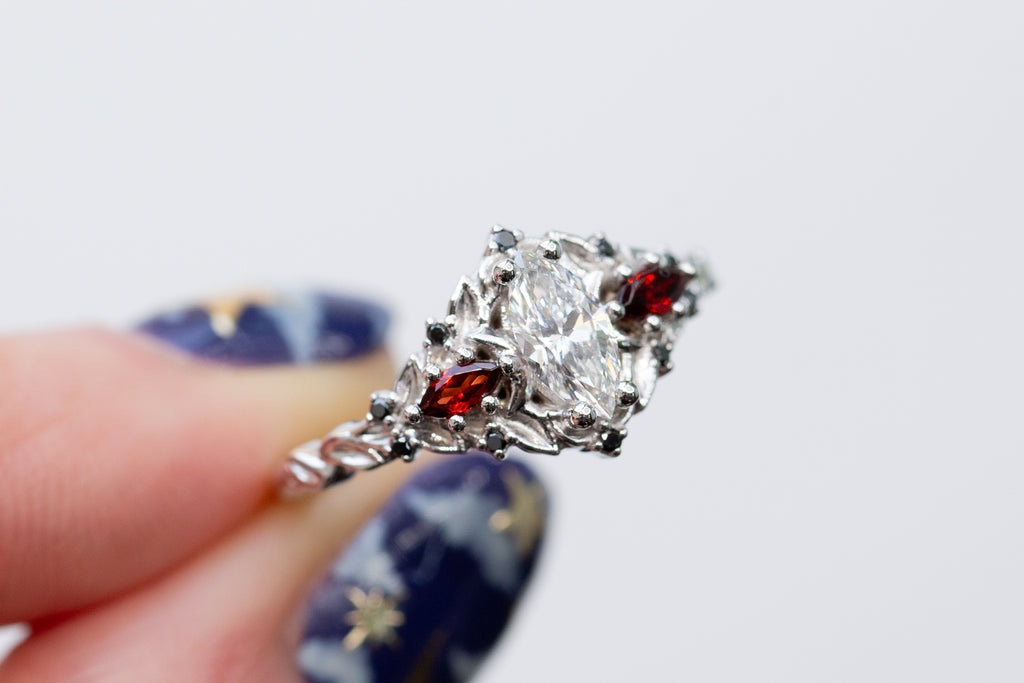 -Side/accent stones: 4x2mm marquise garnet, 1mm round black diamond