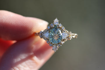 -1.29ct pear light green starbrite sapphire, cut by John Dyer. This stone is a fully light green/mint color, the lighting in the pictures was just reflecting the yellow gold through the middle of the stone. 8.7x6.3mm, Montana mostly eye clean, unheated