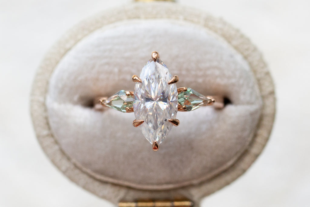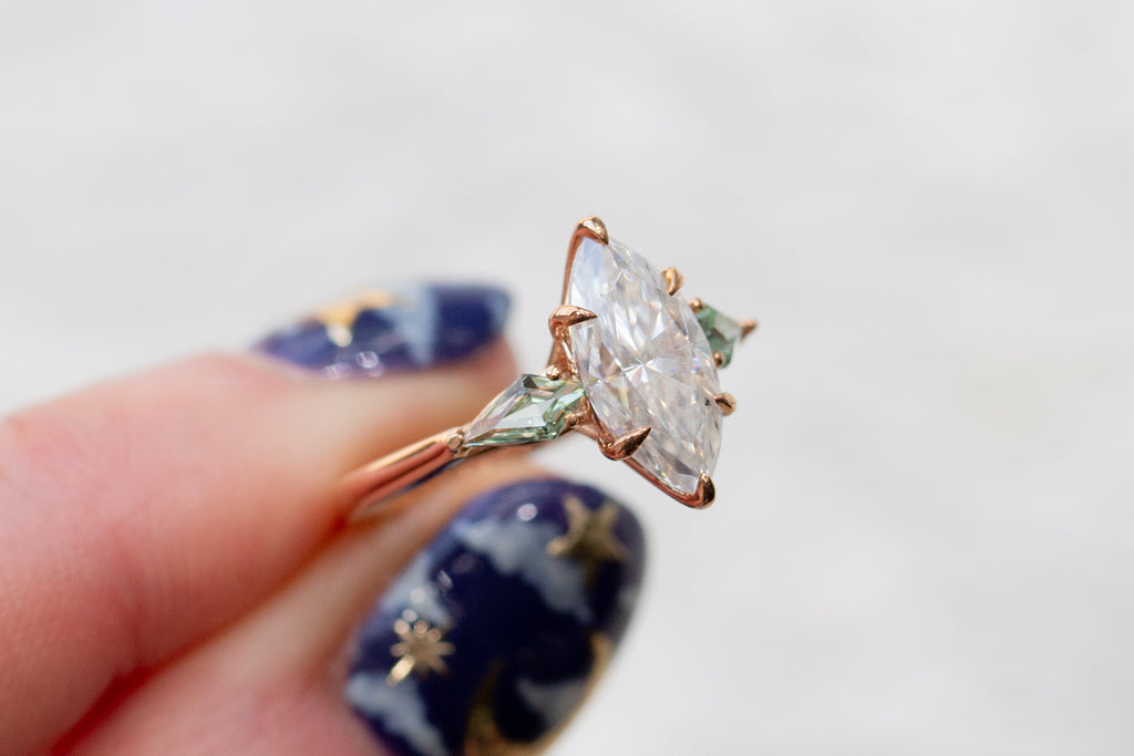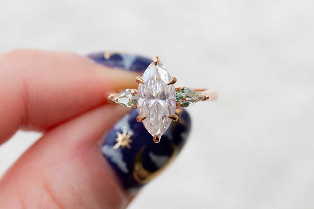 -center stone: 12x6mm DEF marquise moissanite