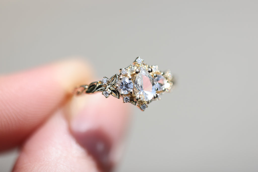 - Side/accent stones: 3mm round white sapphire, 1mm lab diamond