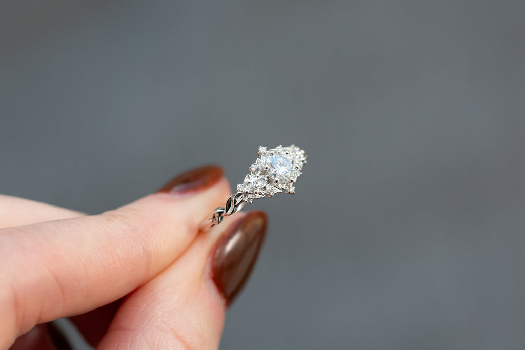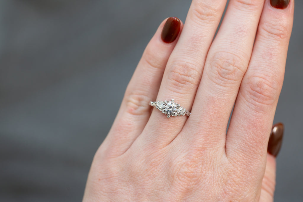 READY TO SHIP - Size 7, 14k White Gold Briar Rose Three Stone