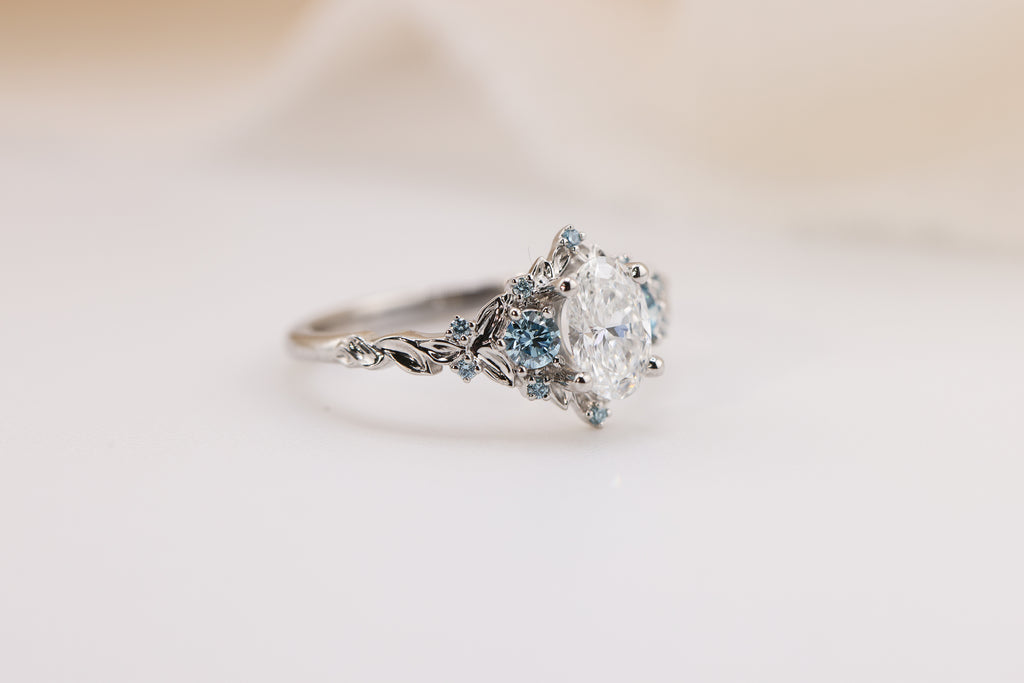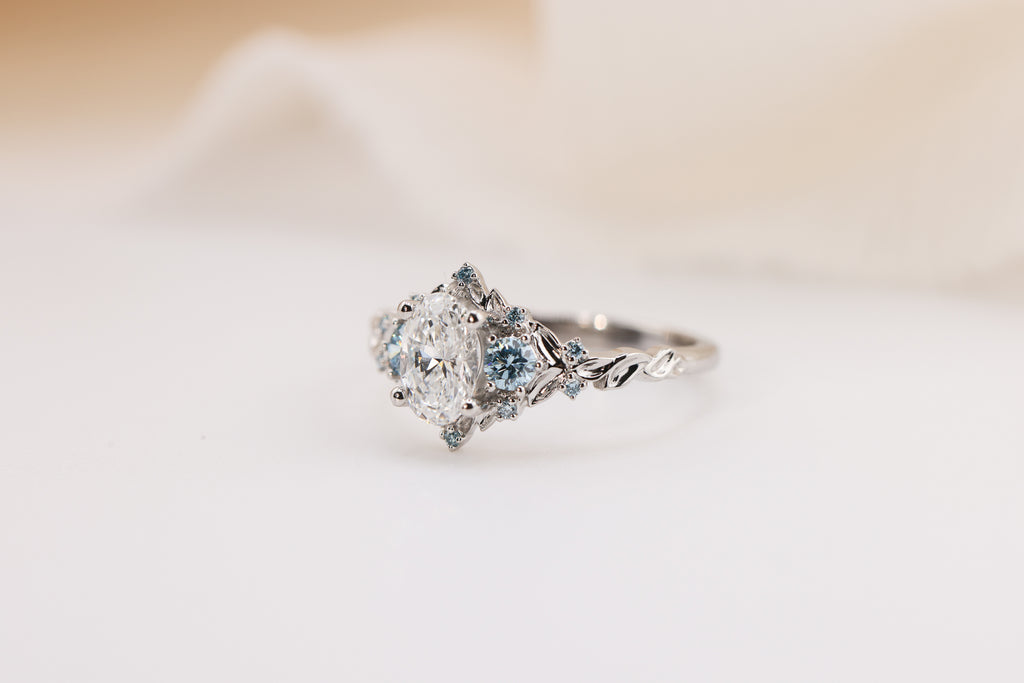 -Side/accent stones: 3mm round aqua diamond, 1mm aqua diamond