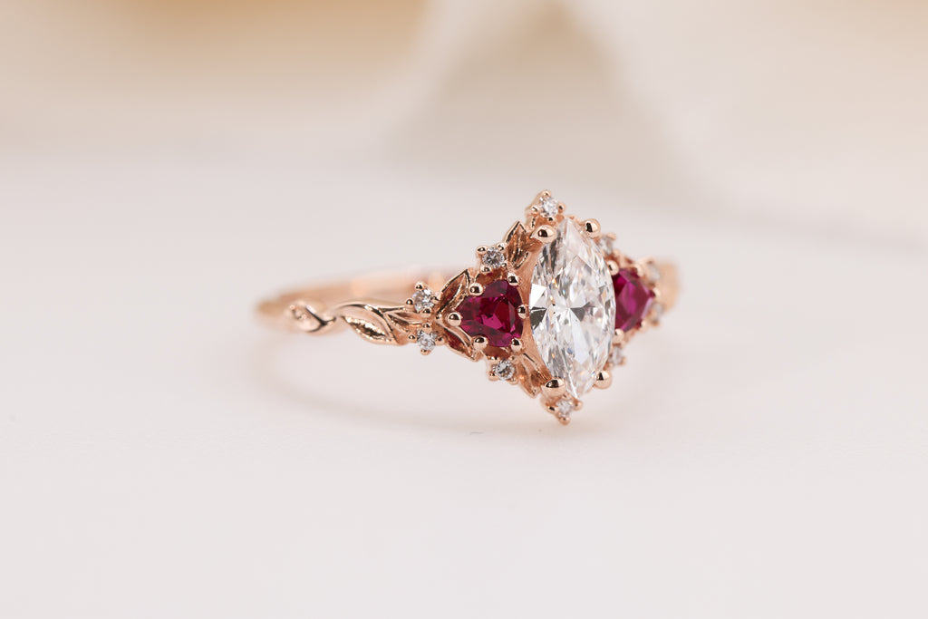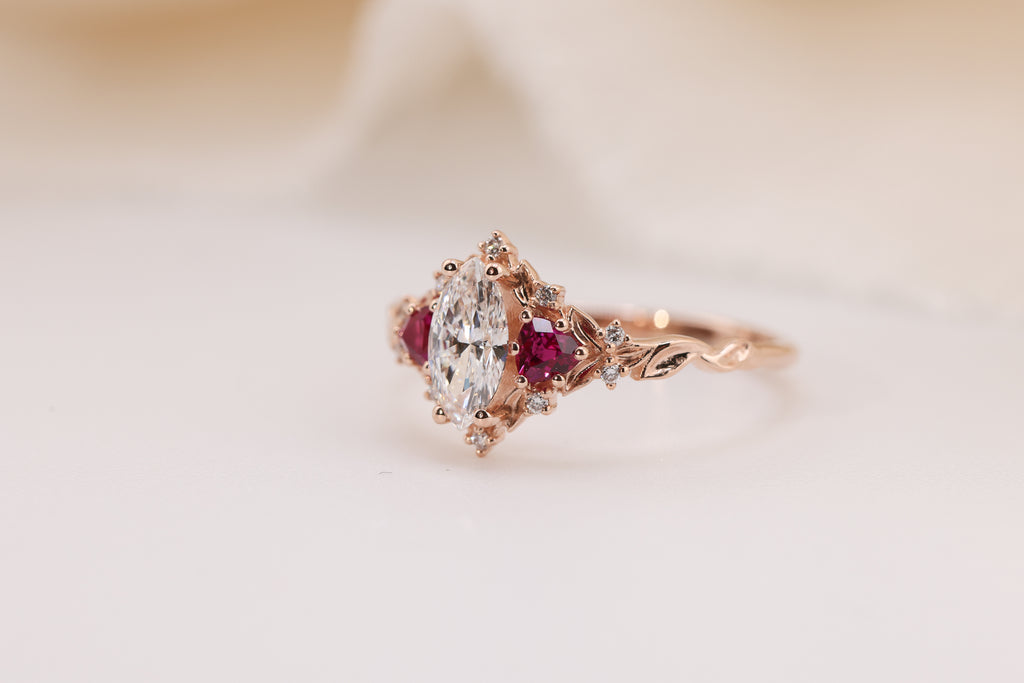 -Side/accent stones: 3mm trillion lab ruby, 1mm lab diamond