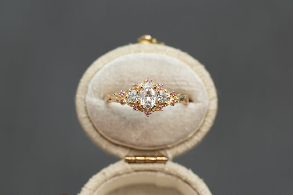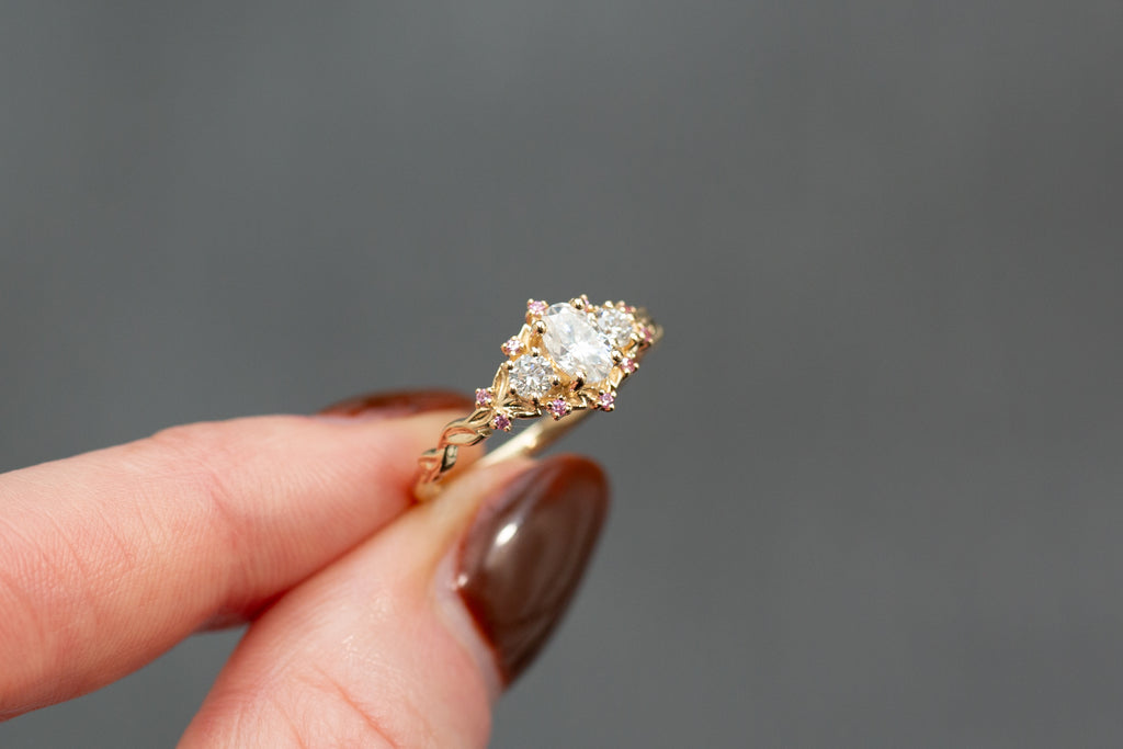 -Sides/Accents: 3mm round moissanite, 1mm pink sapphire