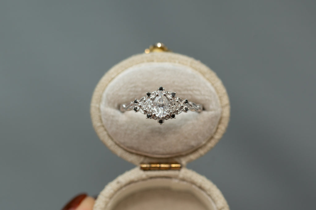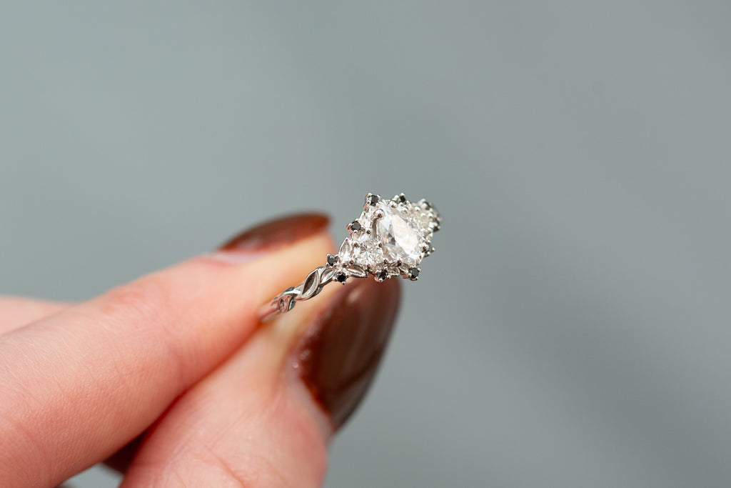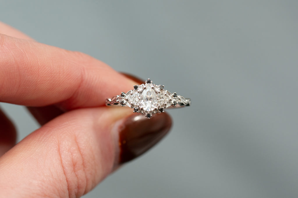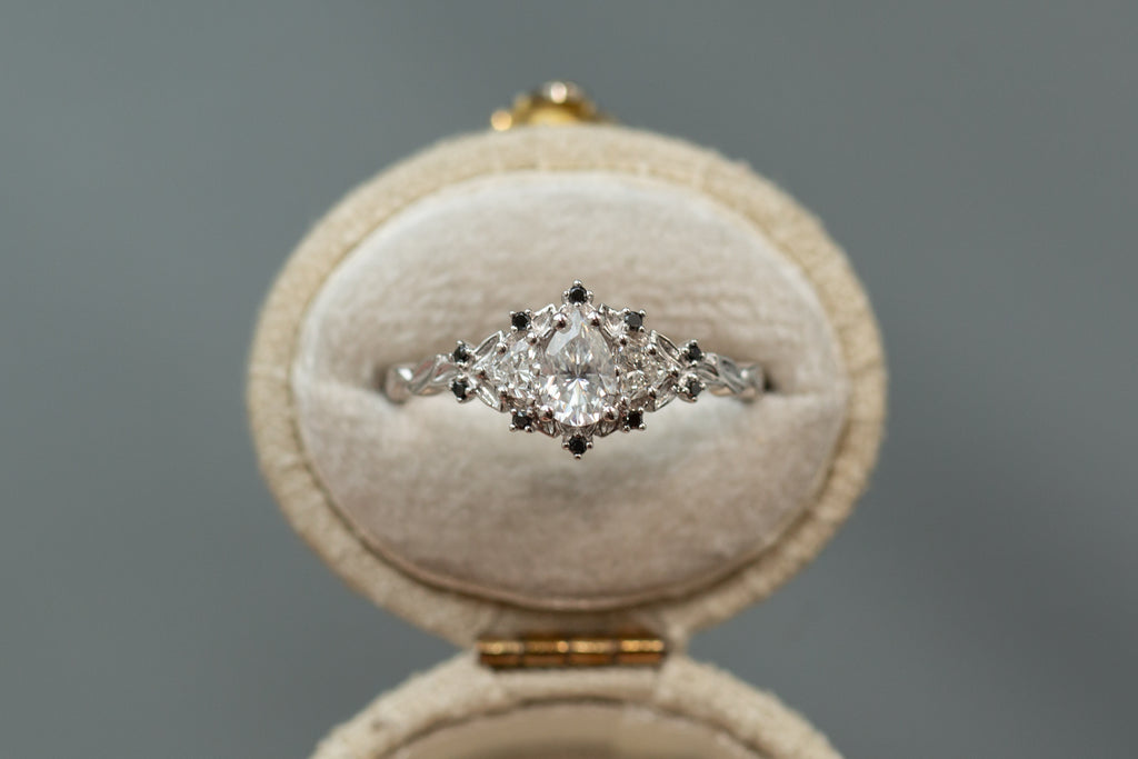 -Sides/Accents: 3mm trillion moissanite, 1mm black diamond