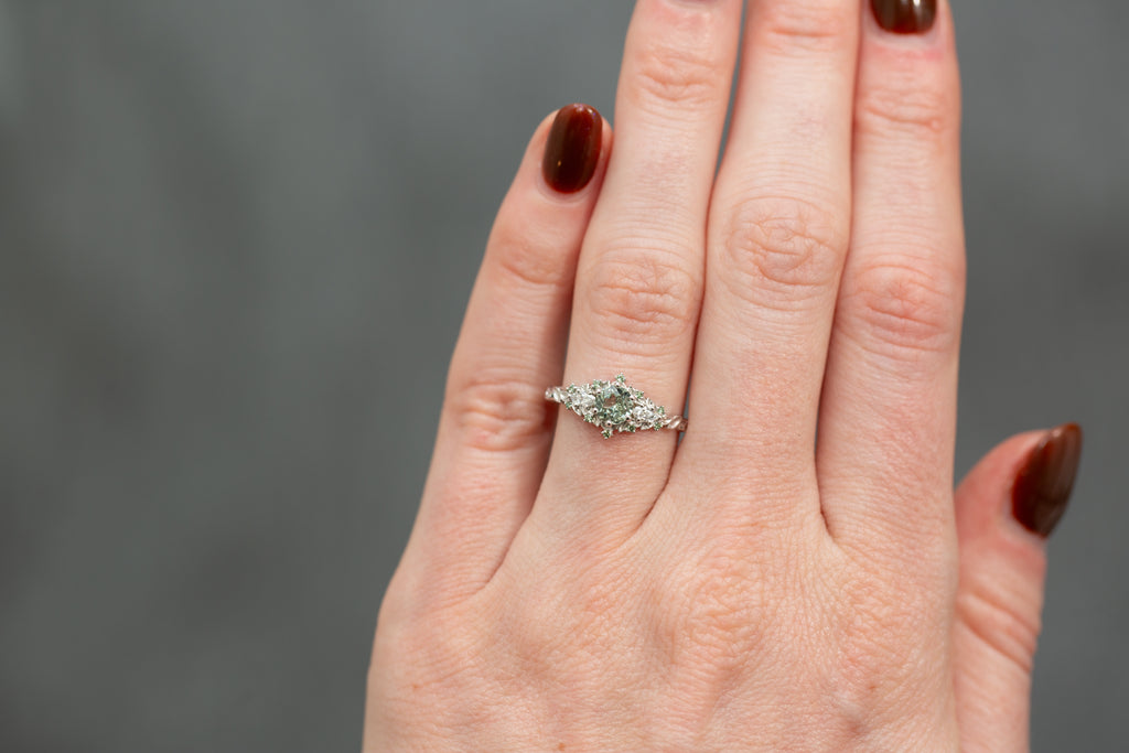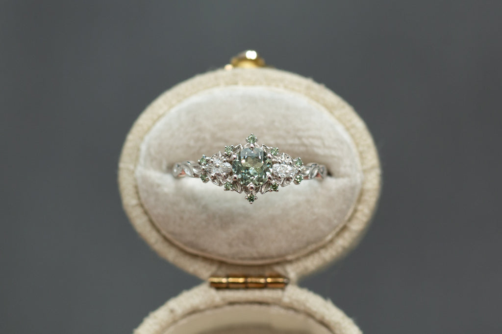 -Sides/Accents: 4x2mm marquise moissanite, 1mm dark green diamond