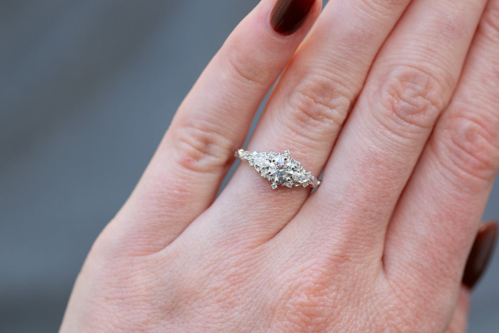 -Sides/Accents: 4x2mm marquise moissanite, 1mm lab diamond