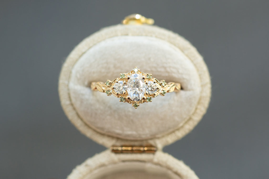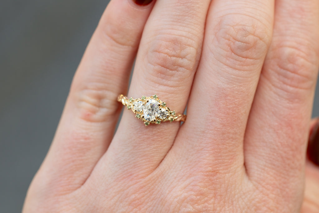 -Sides/Accents: 3mm round moissanite, 1mm mint diamond