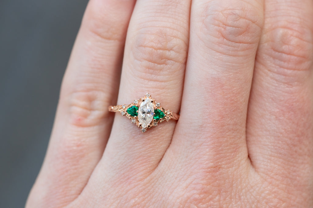 -Sides/Accents: 3mm trillion lab emerald, 1mm lab diamond