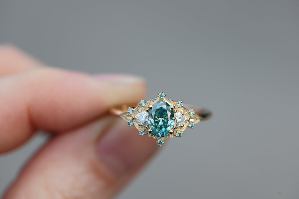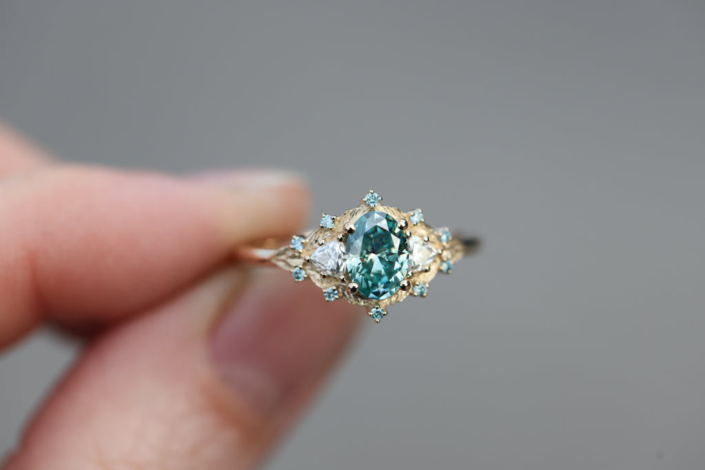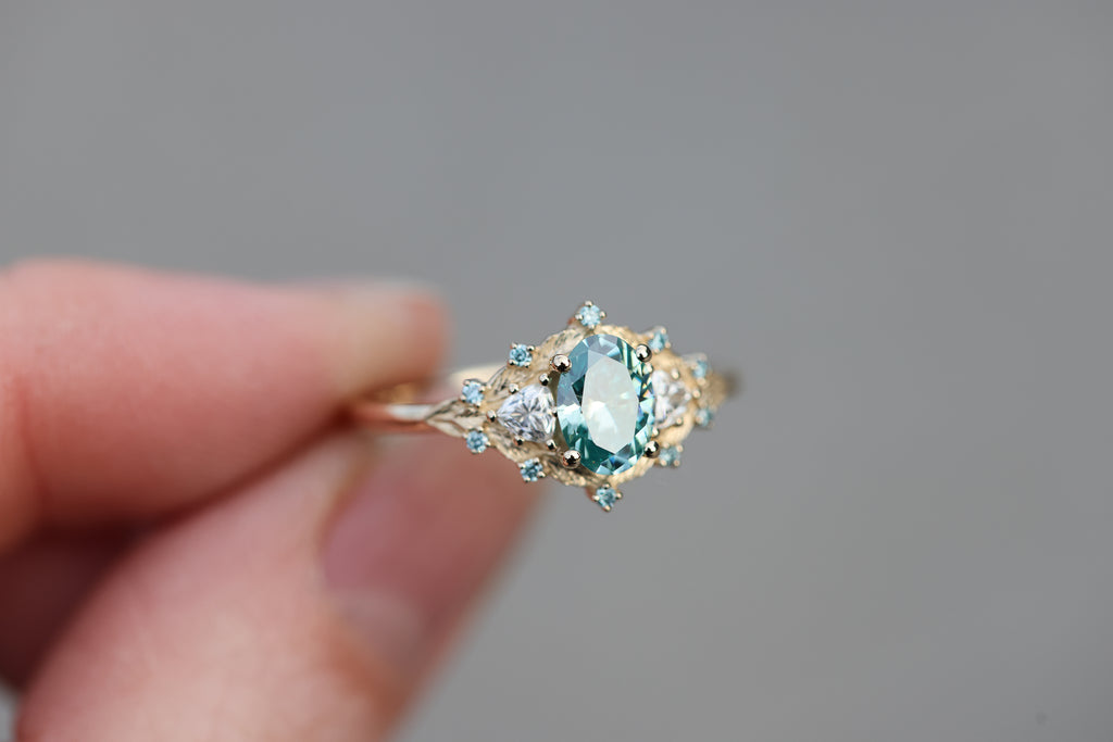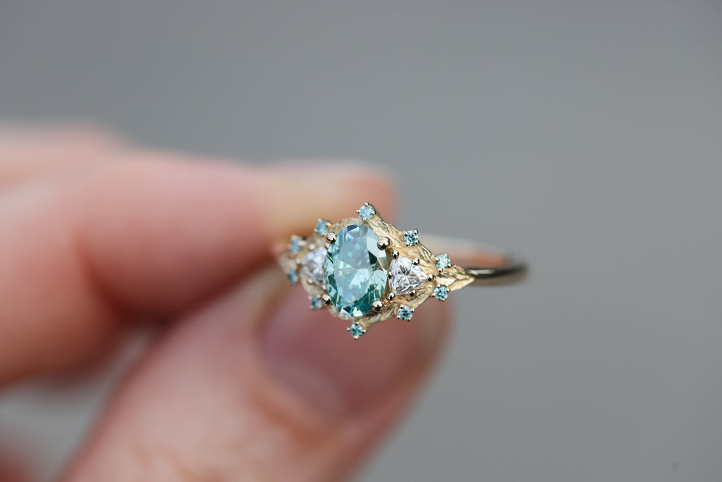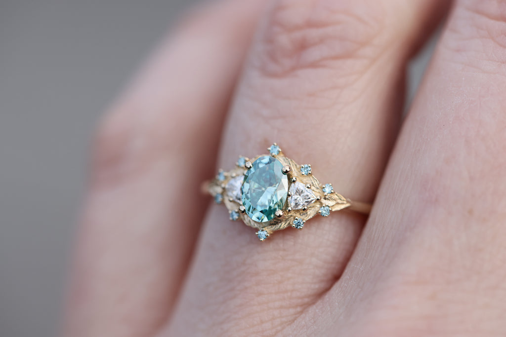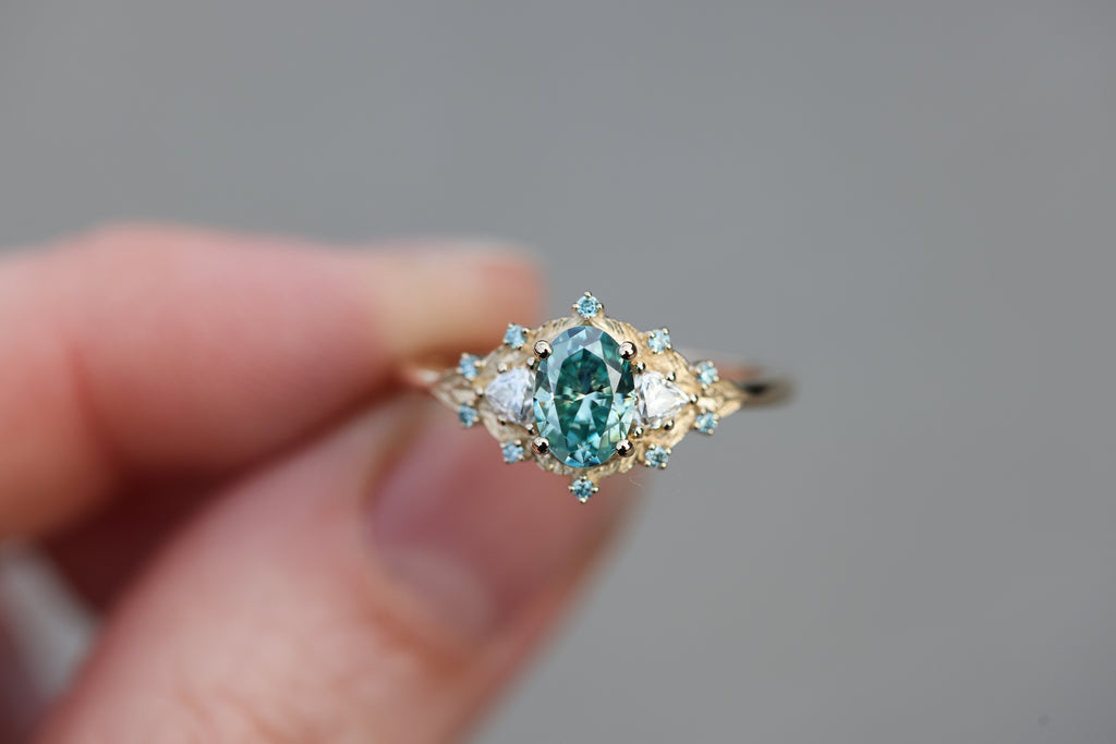 -Sides/Accents: 3mm trillion moissanite, 1mm aqua diamonds