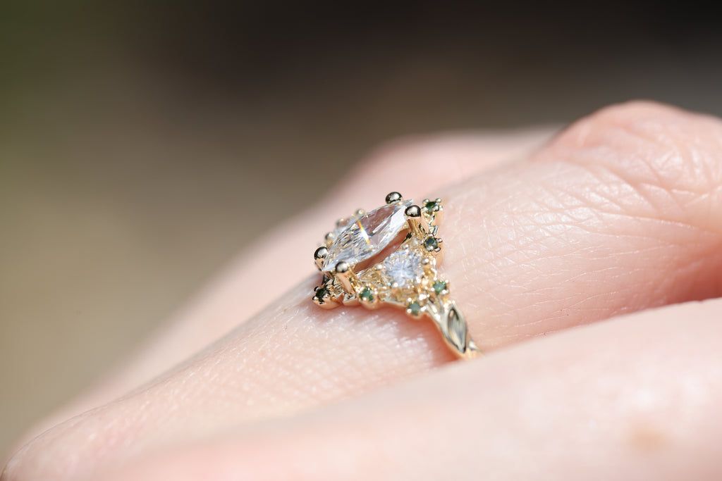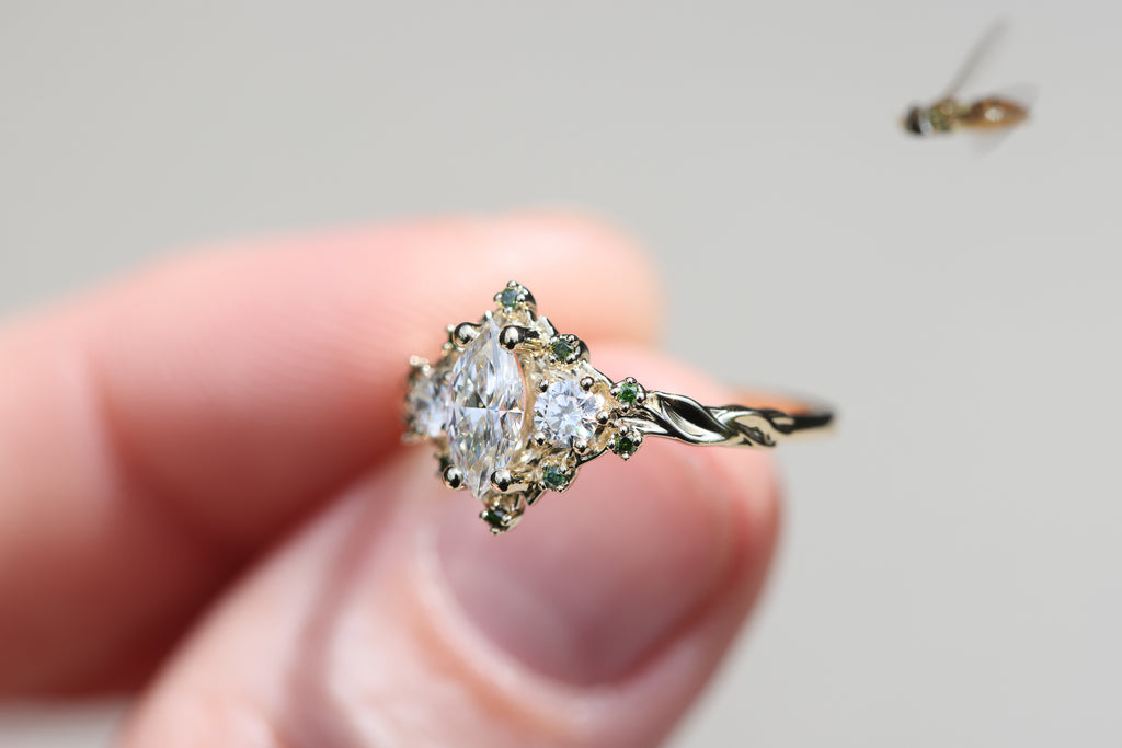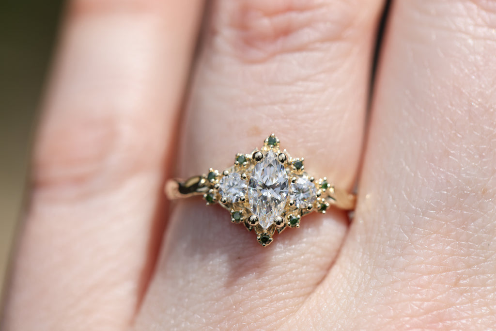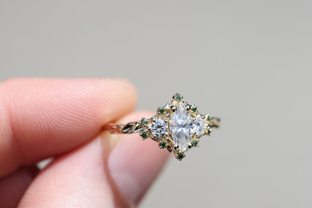 - Side/accent stones: 3mm lab diamond, 1mm dark green diamond