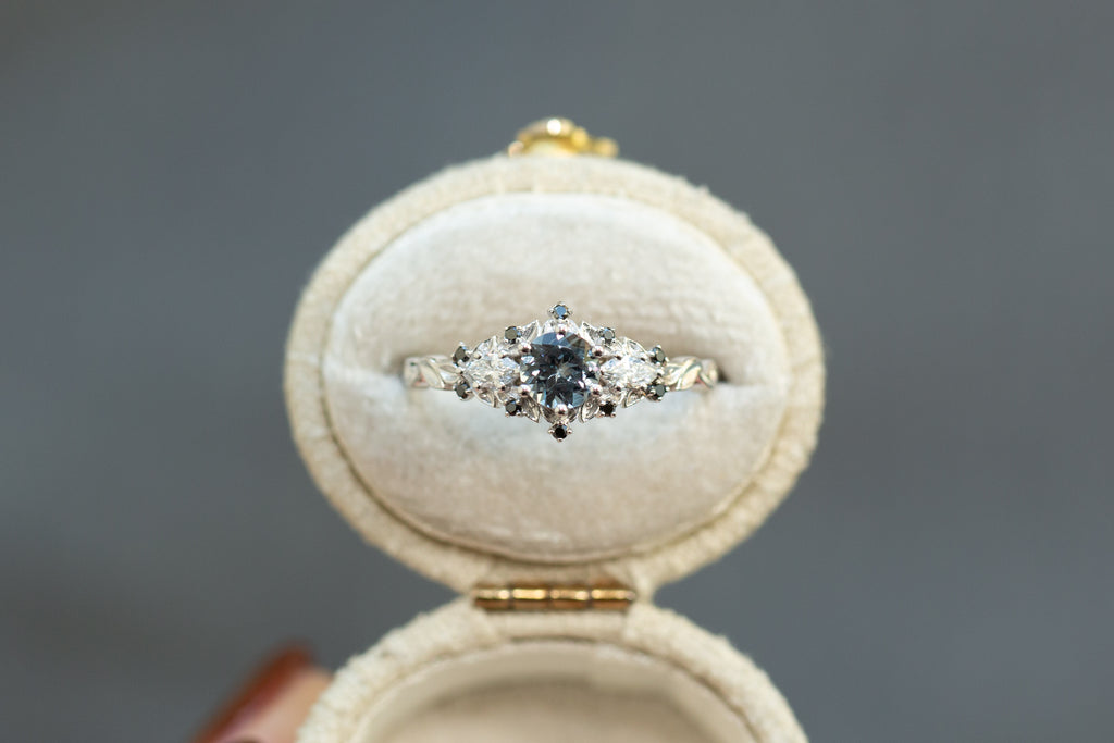 -Sides/Accents: 4x2mm marquise lab diamond, 1mm black diamond