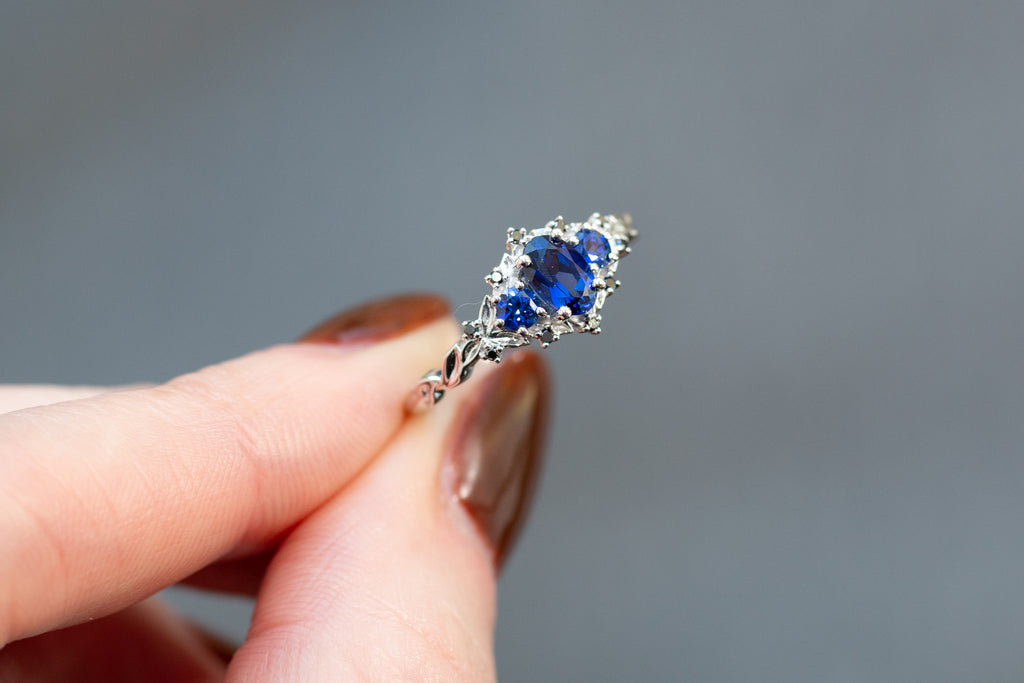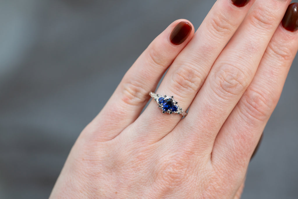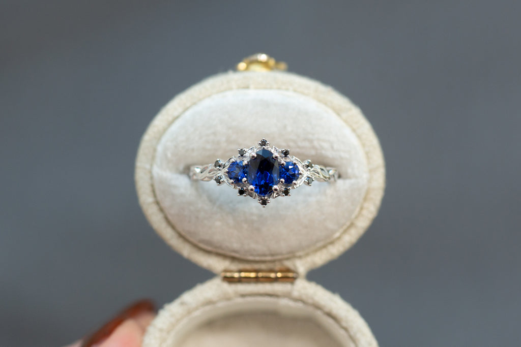 -Sides/Accents: 3mm round lab blue sapphire, 1mm black diamond