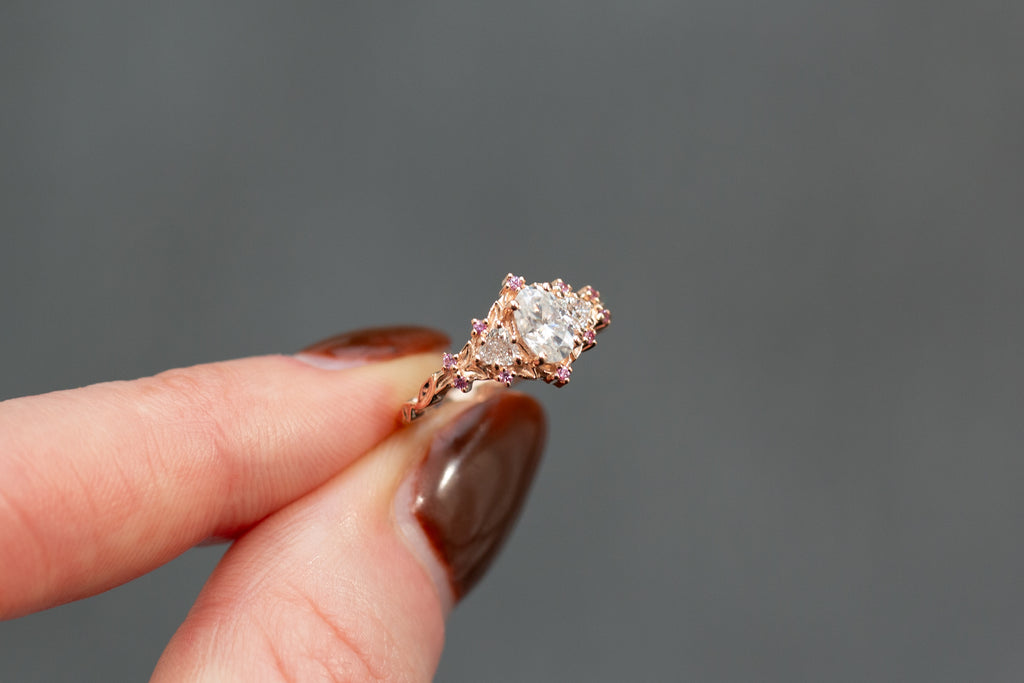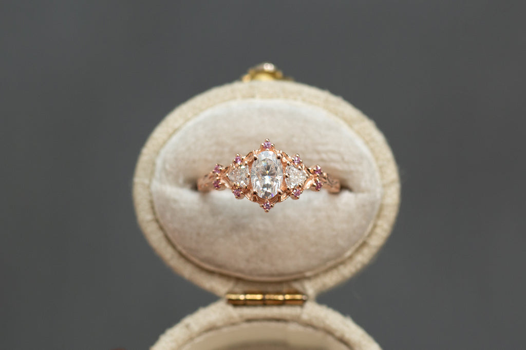 -Sides/Accents: 3mm trillion moissanite, 1mm pink sapphire