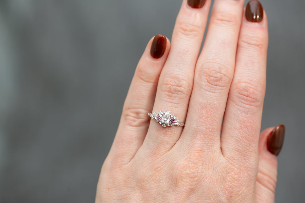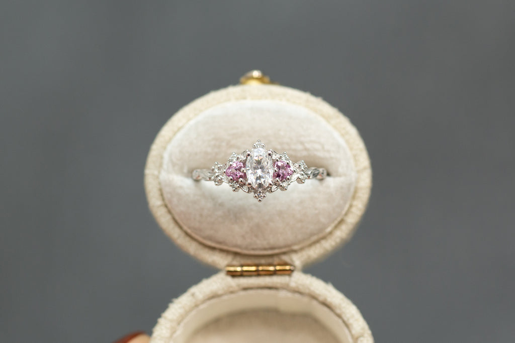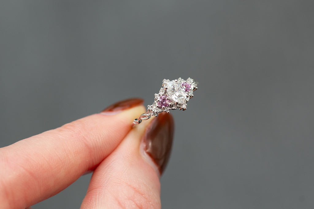 -Sides/Accents: 3mm trillion lab pink sapphire, 1mm lab diamond