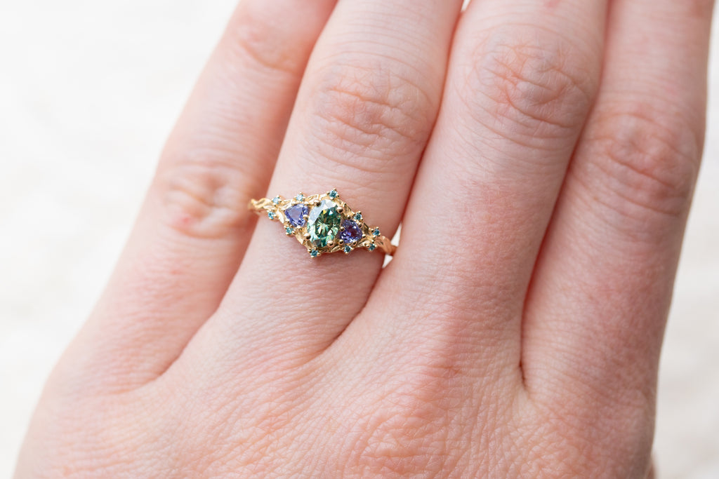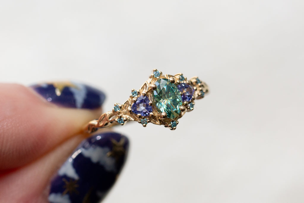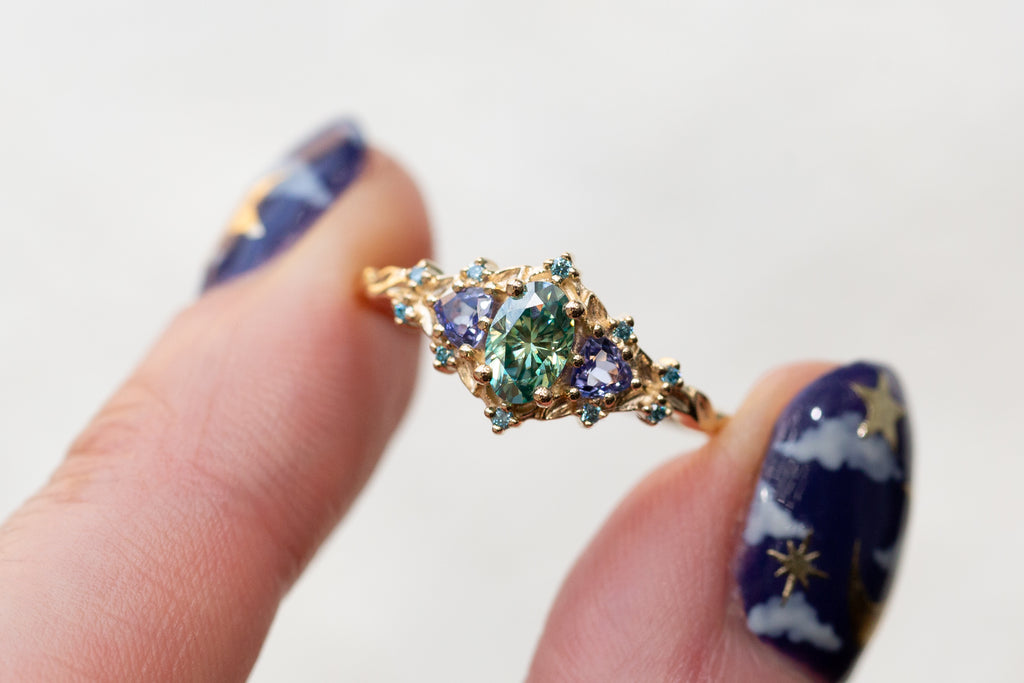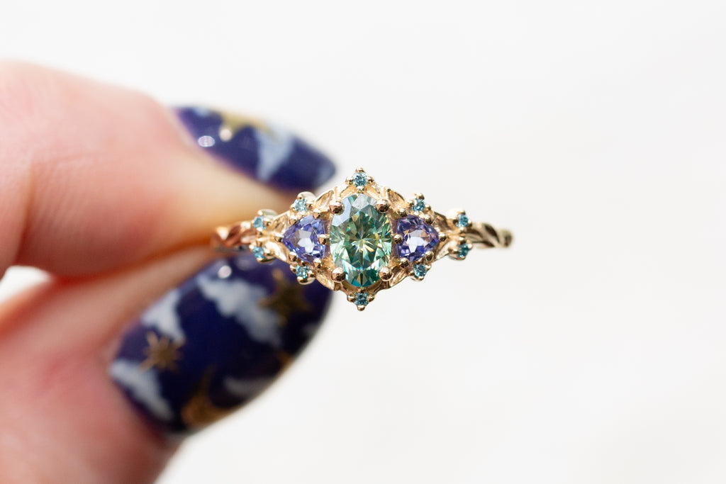 -side/accent stones: 3mm trillion tanzanite, 1mm round aqua irradiated diamond