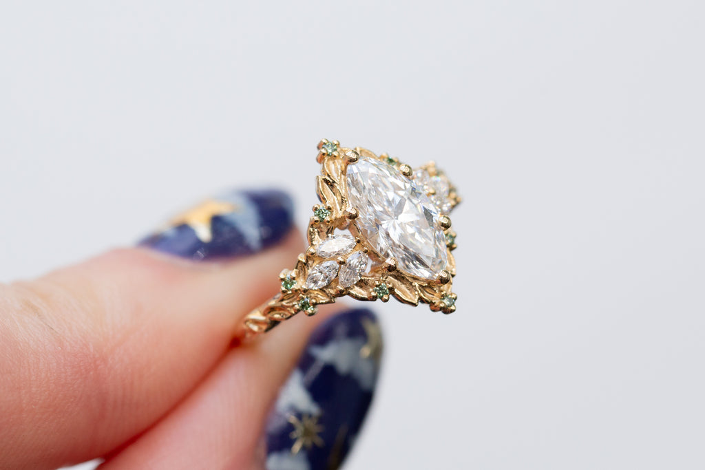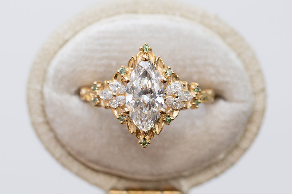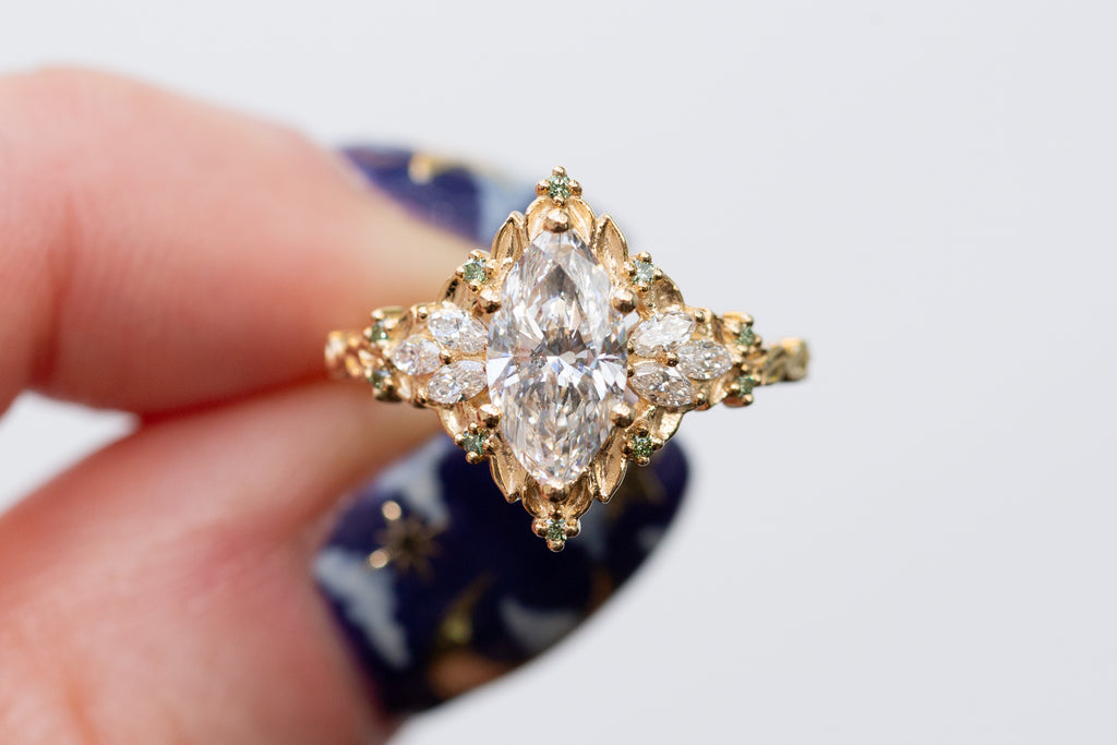 -Side/accent stones: 3x1.5mm marquise lab diamond, 1mm round mint irradiated diamond