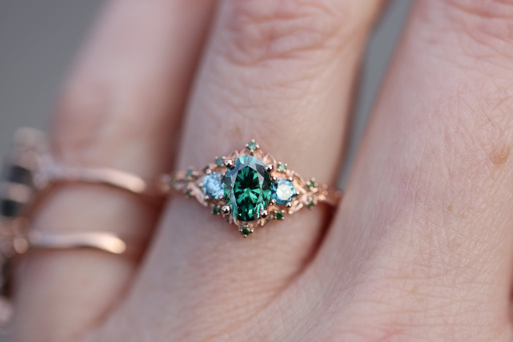 -Sides/Accents: 3mm aqua diamonds, 1mm dark green diamonds