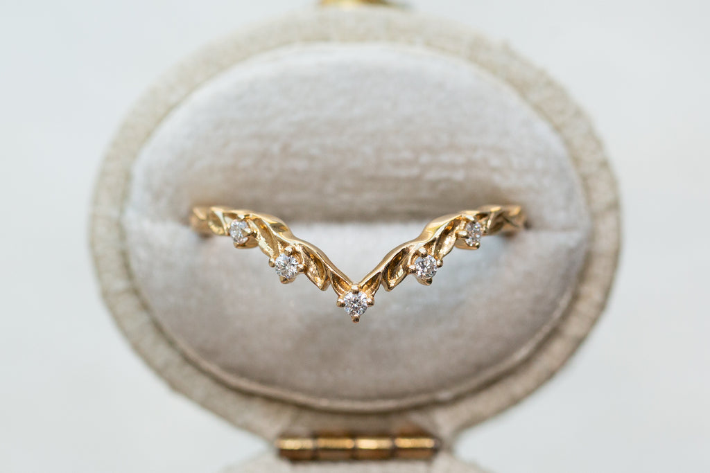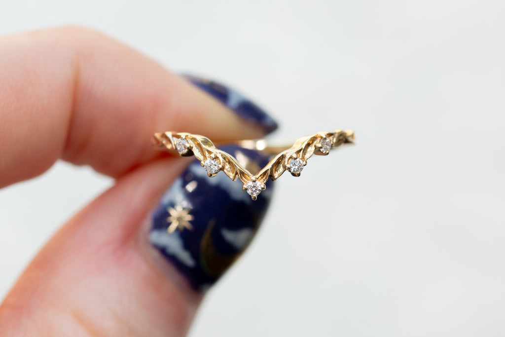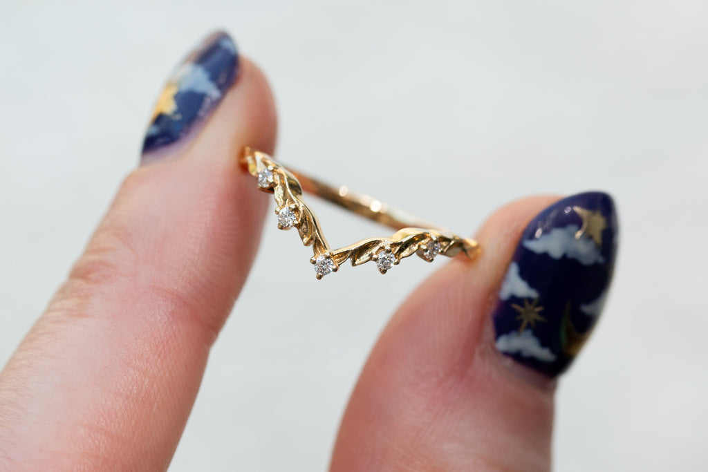 READY TO SHIP- Size 7, 14k yellow gold Chevron Leafy Wedding Band with 1.5mm Accents