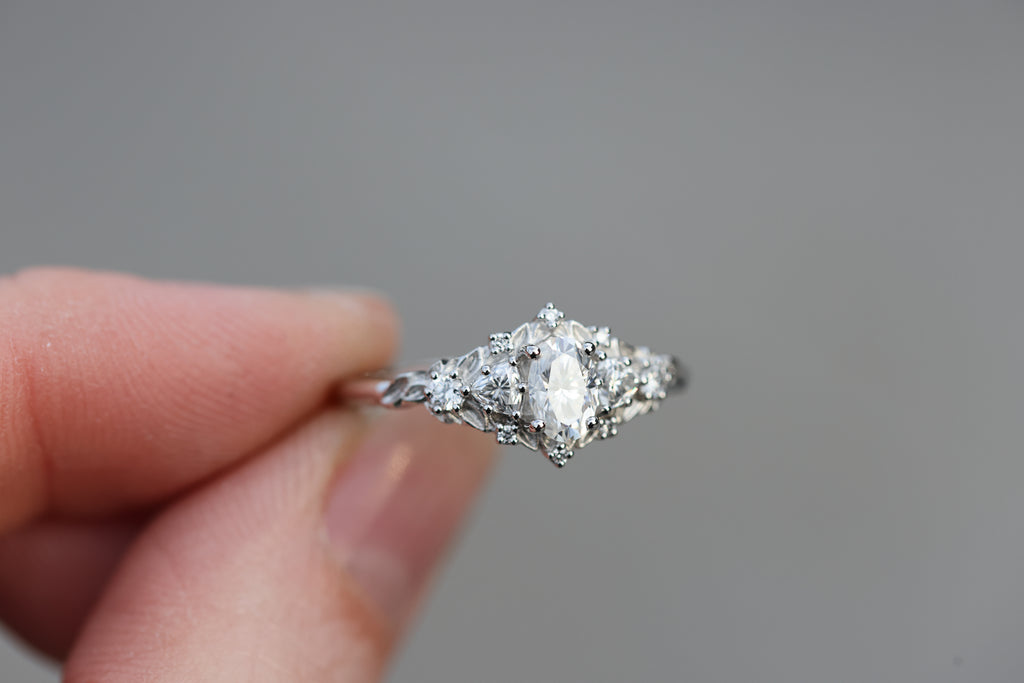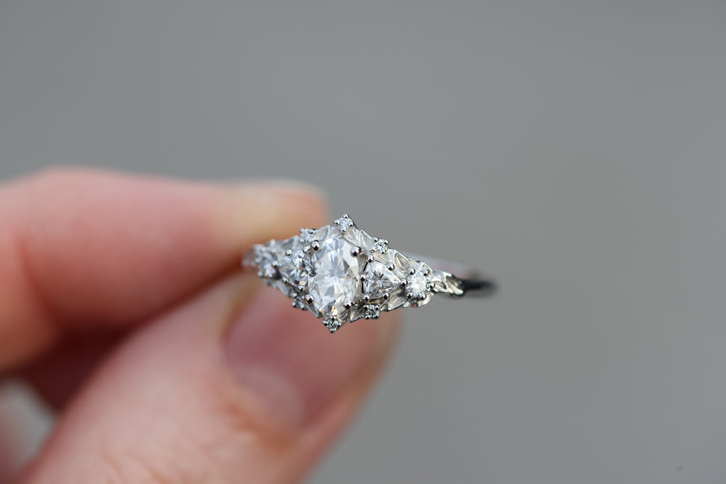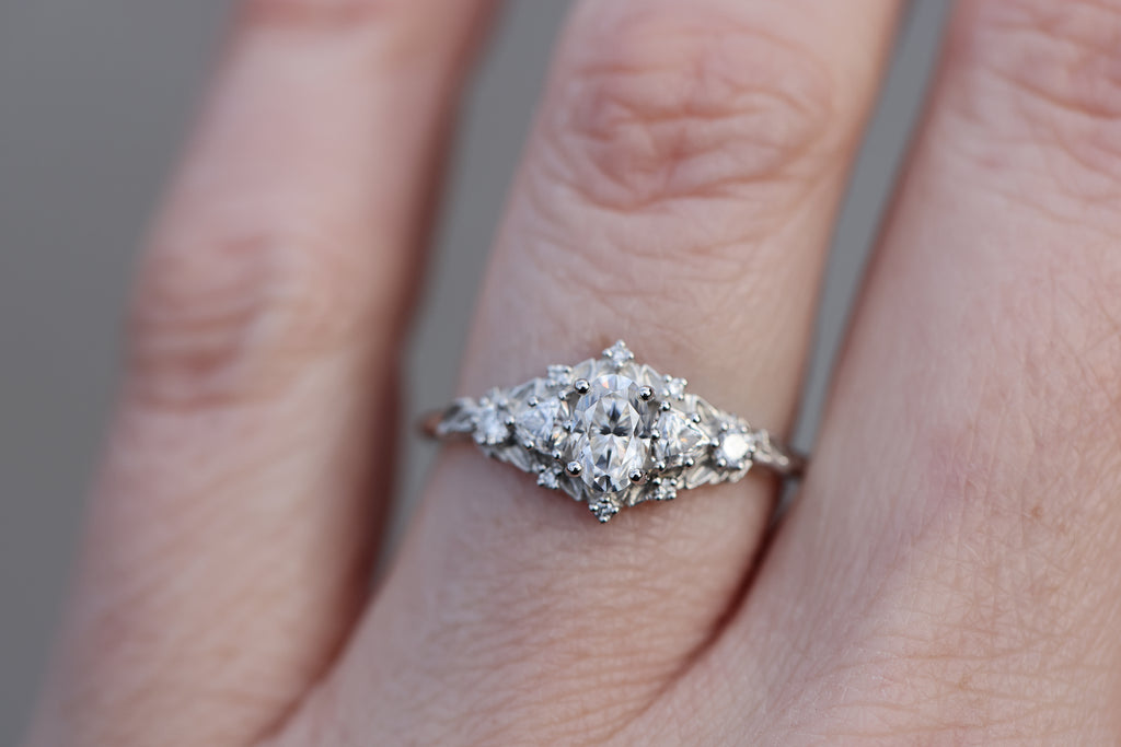 -Sides/Accents: 3mm trillion moissanite, 2mm lab diamond, 1mm lab diamond