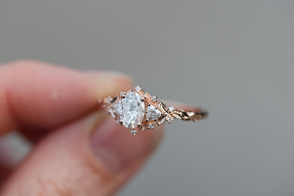 -Sides/Accents: 3mm trillion moissanite, 1mm lab diamond