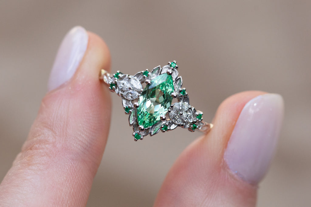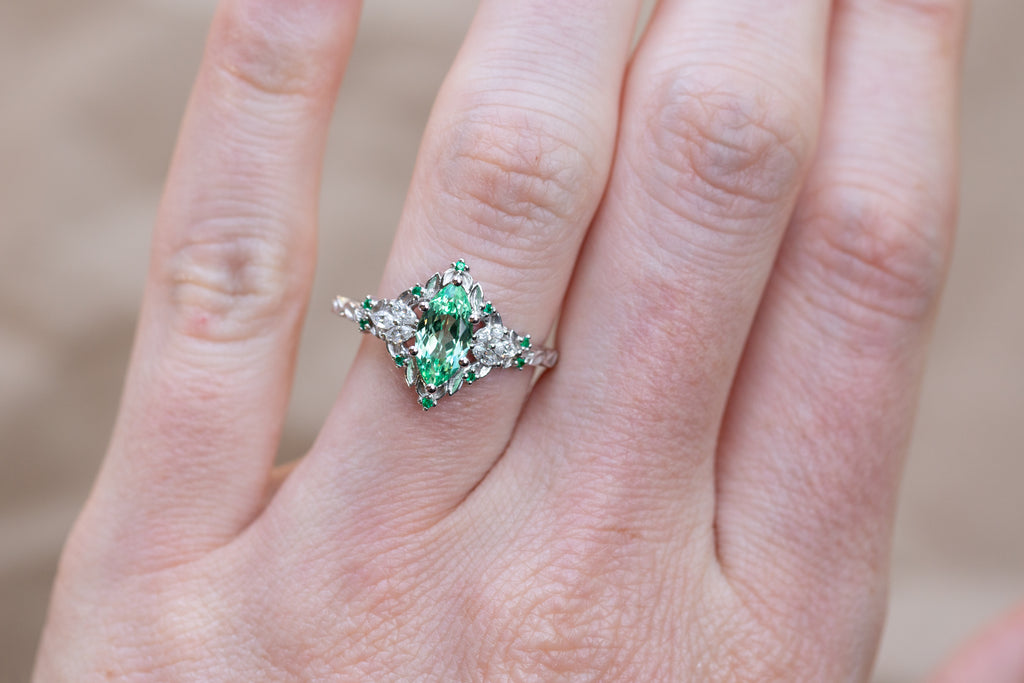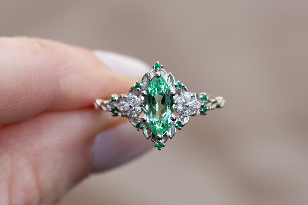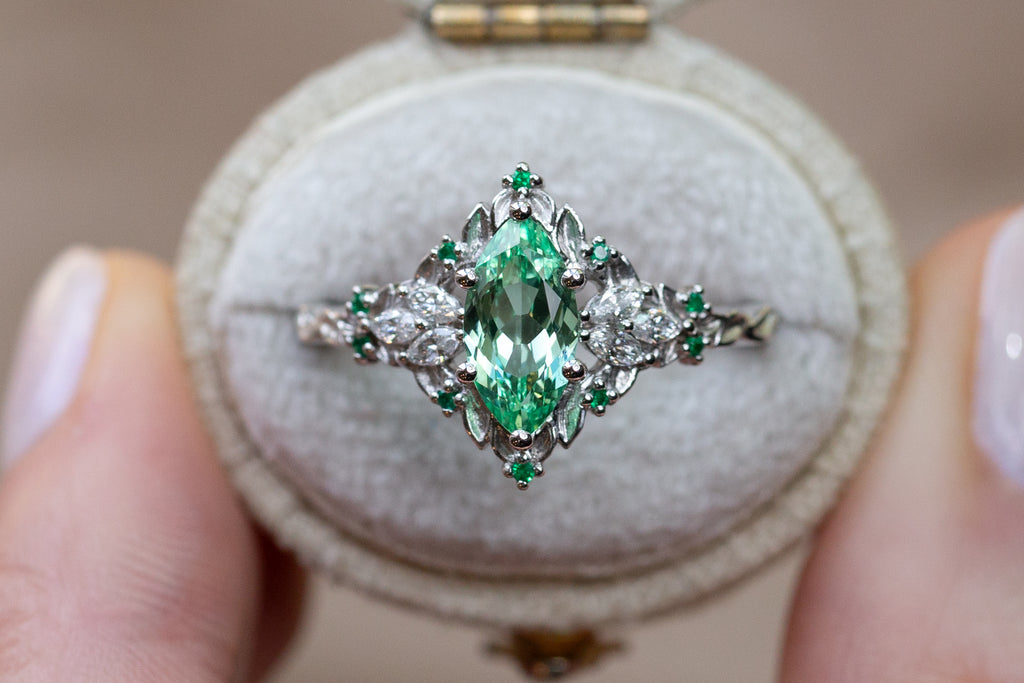 -Side/Accents: 3x1.5mm lab diamond, 1mm natural emerald