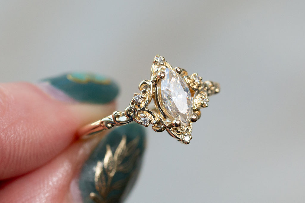 Ready to Ship - Size 7.5, 14k yellow gold Briar Rose Three Stone