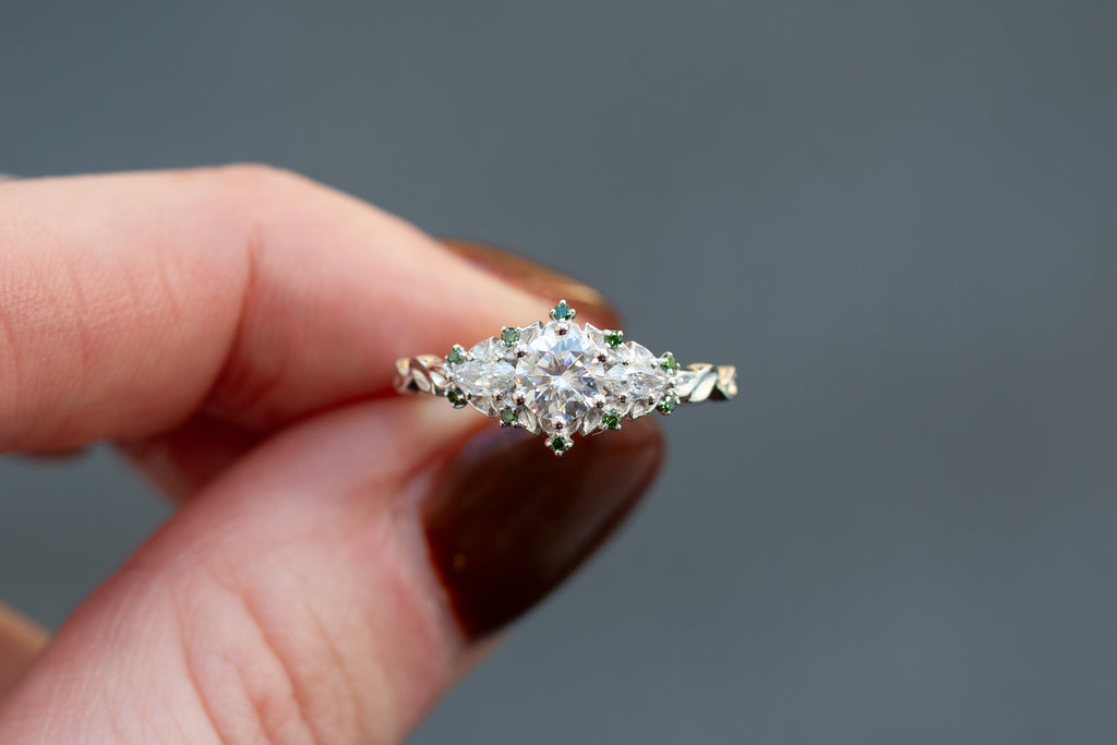 READY TO SHIP - Size 6.75, 14k White Gold Briar Rose Three Stone