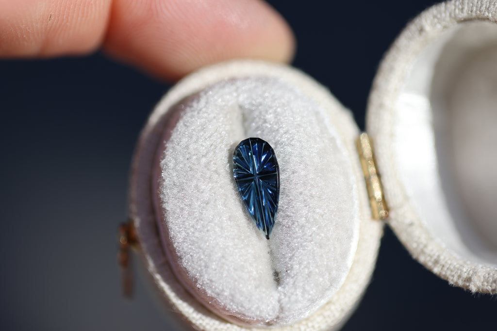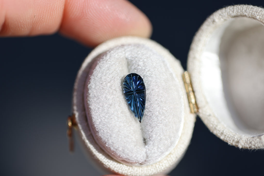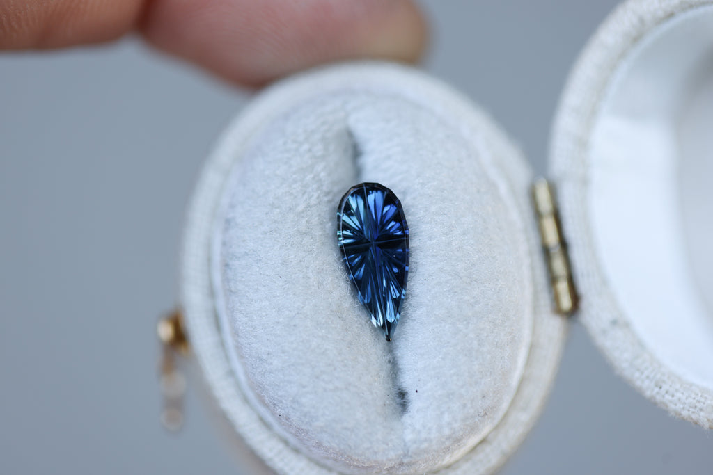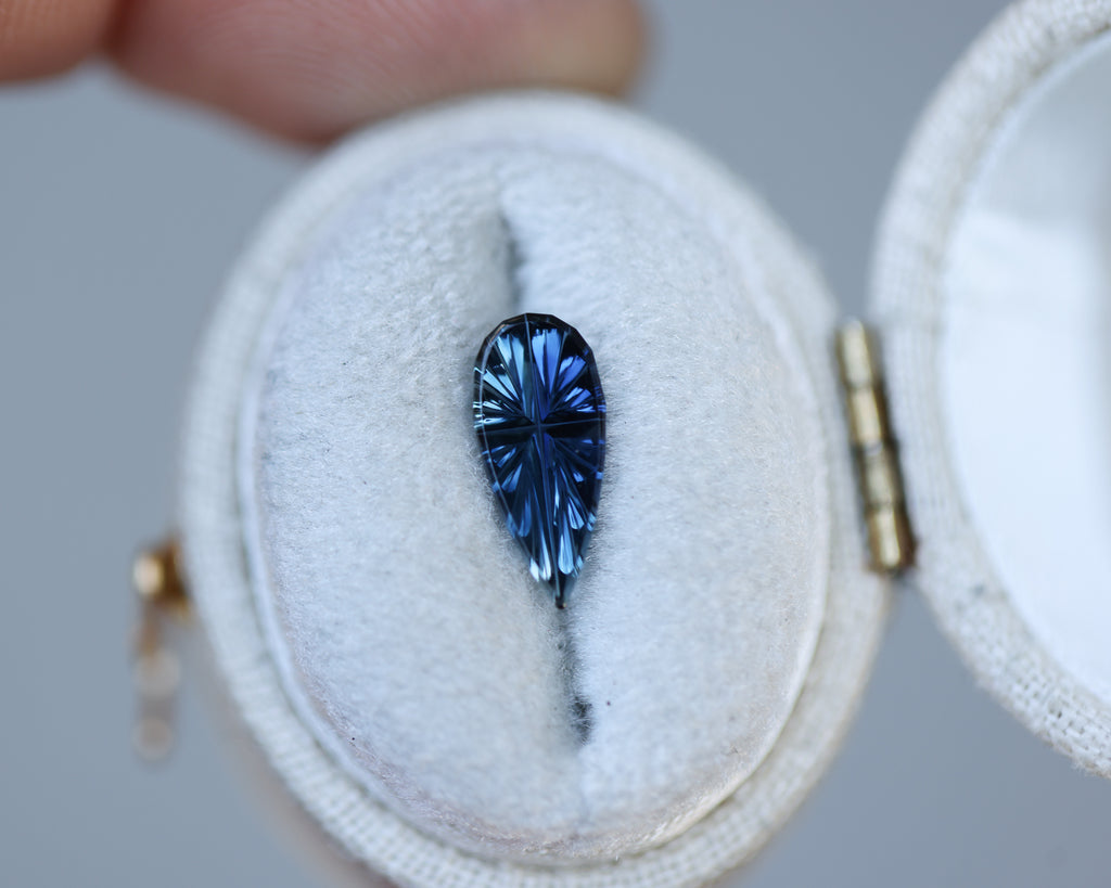 This absolutely incredible rich blue teal pear sapphire is a gorgeous custom Starbrite cut from award winning gem cutter John Dyer!