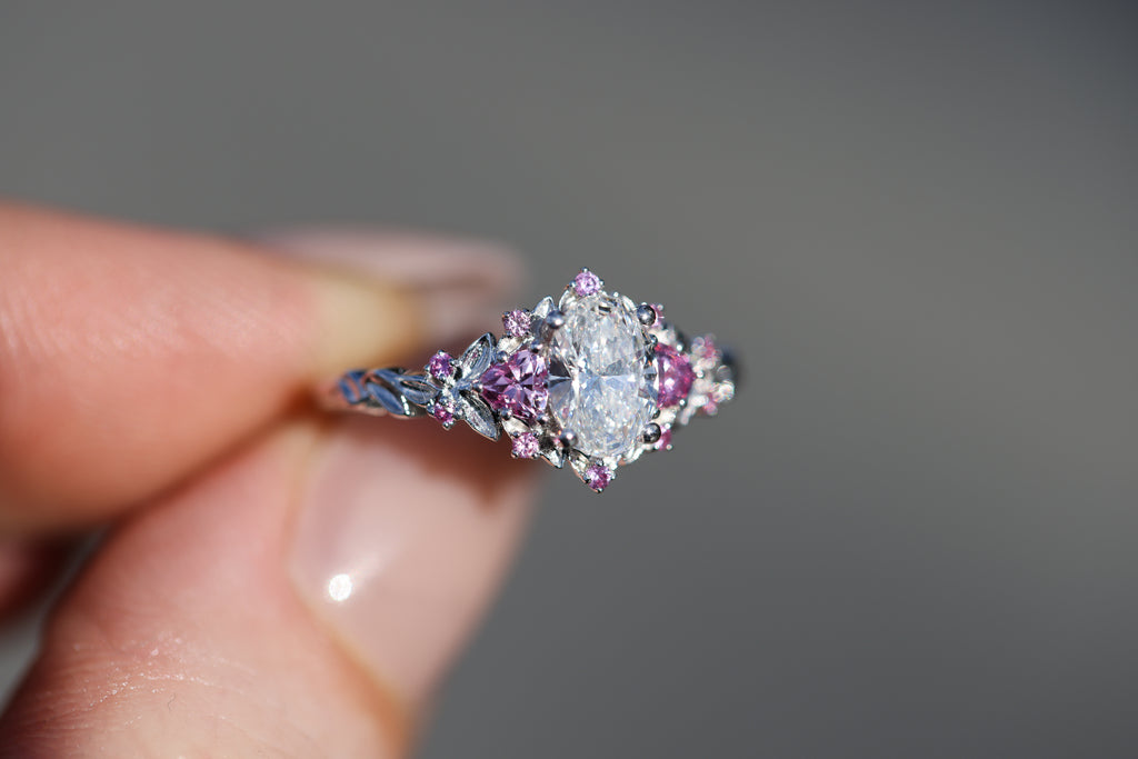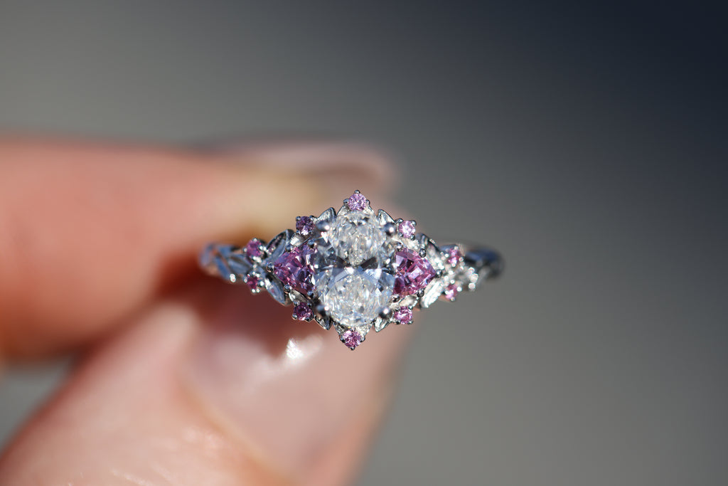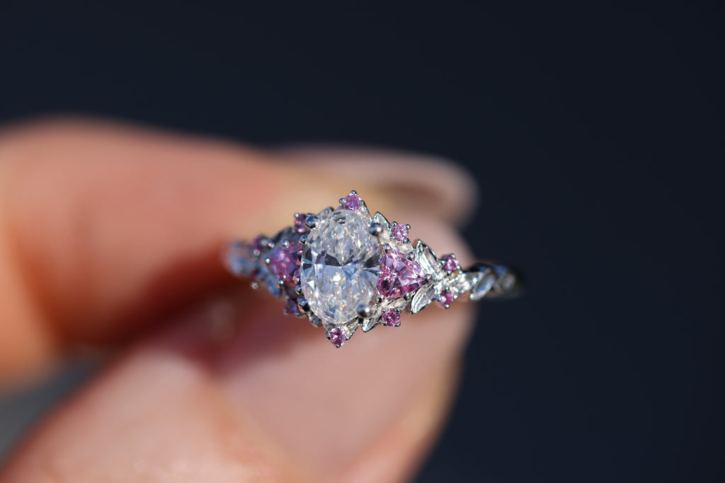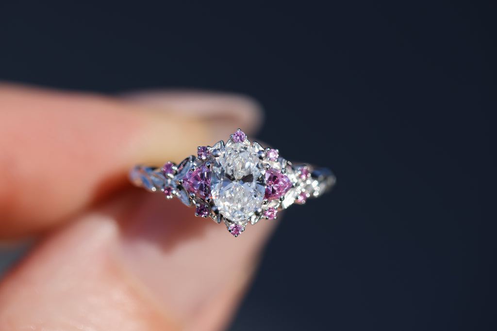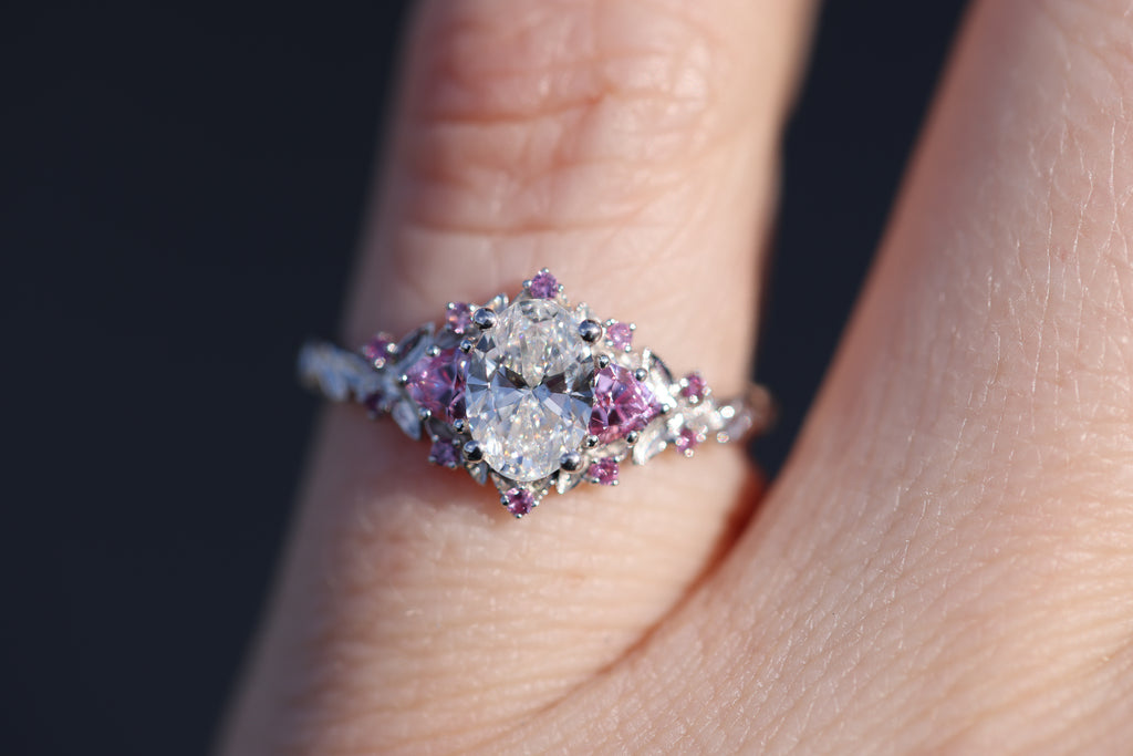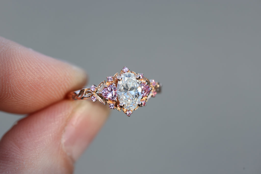 Briar rose three stone with 7x5mm oval lab diamond center and pink sapphires