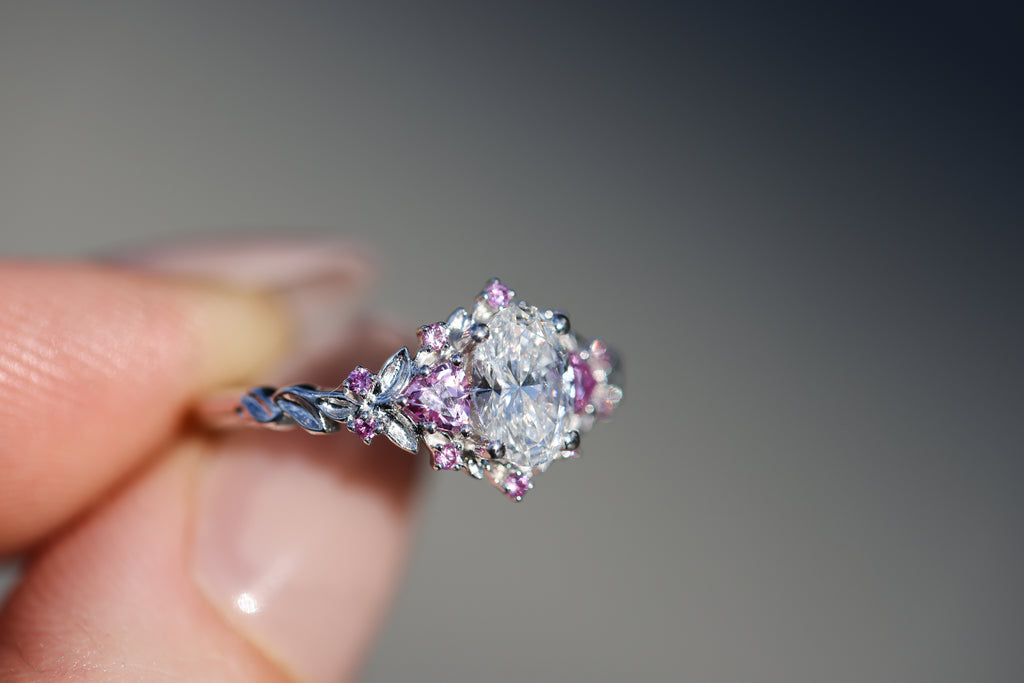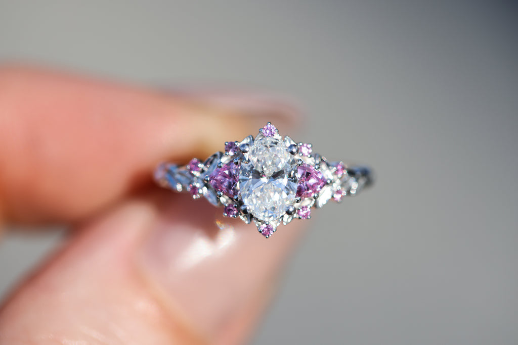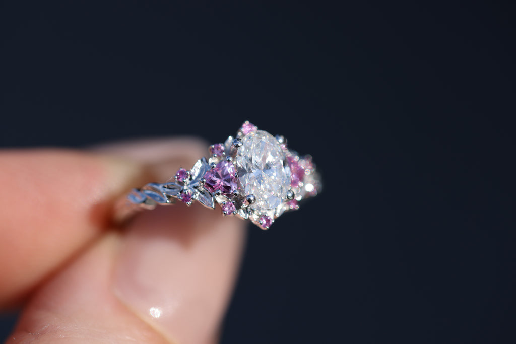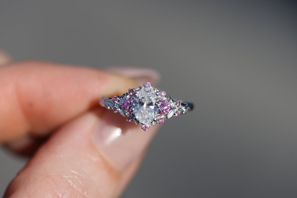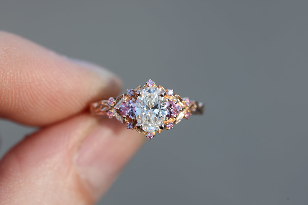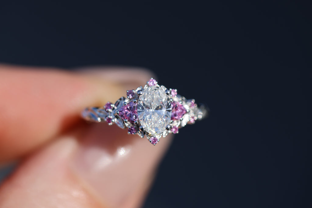 Briar rose three stone with 7x5mm oval lab diamond center and pink sapphires