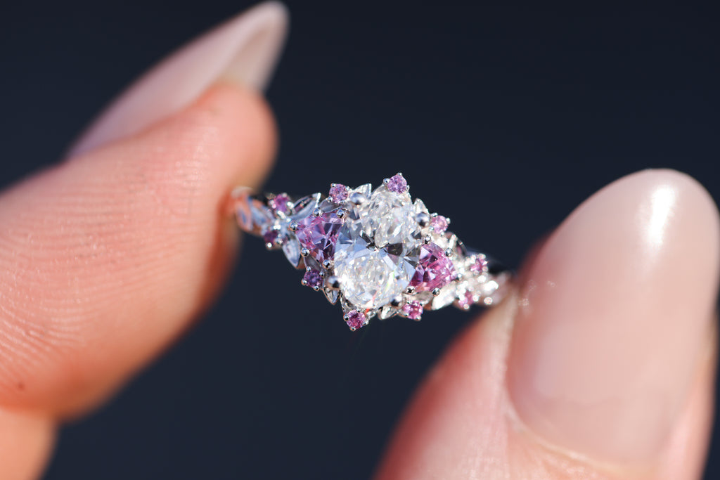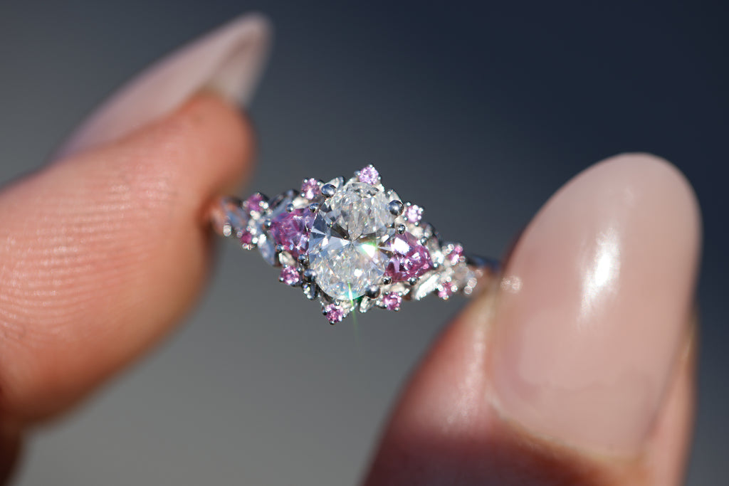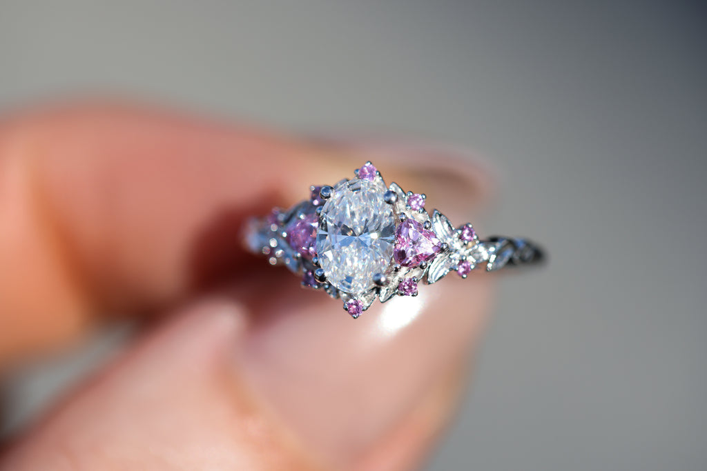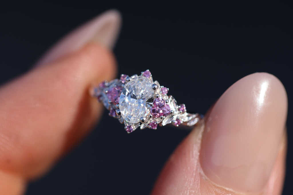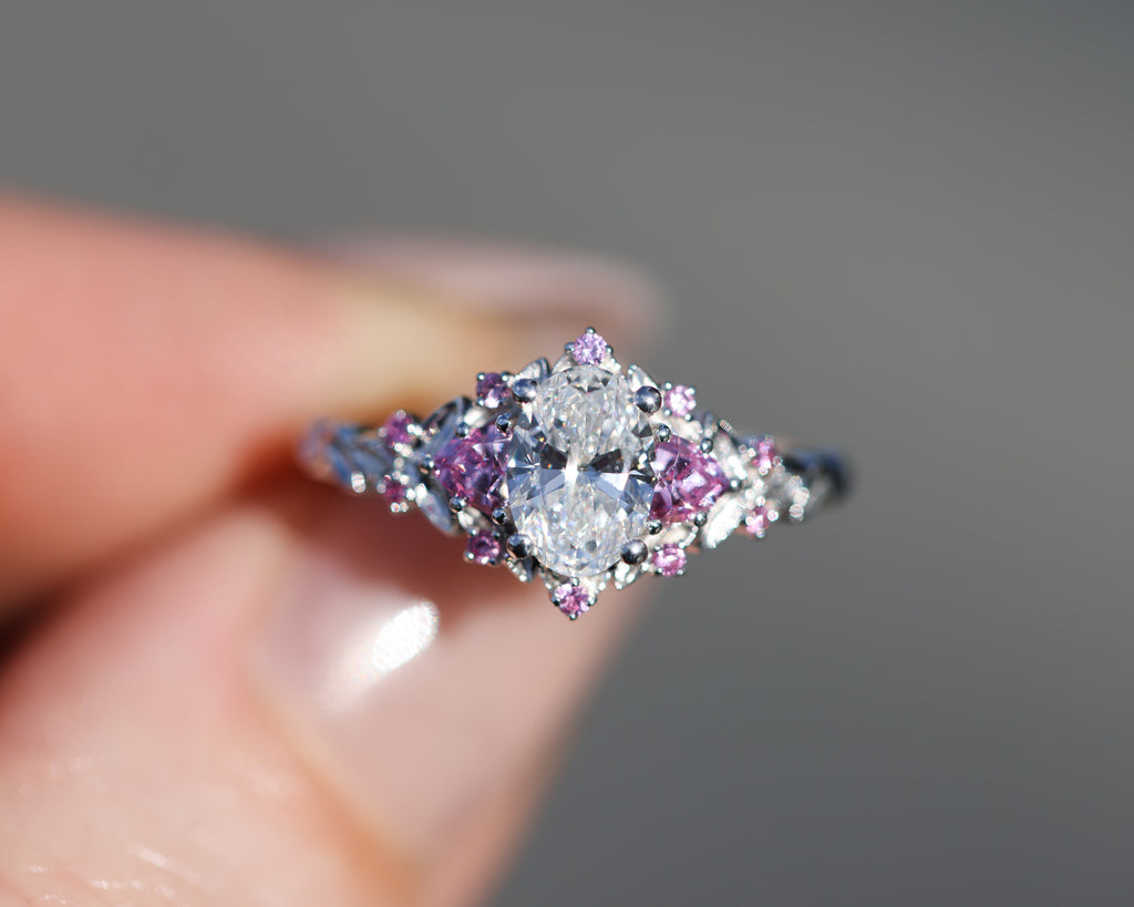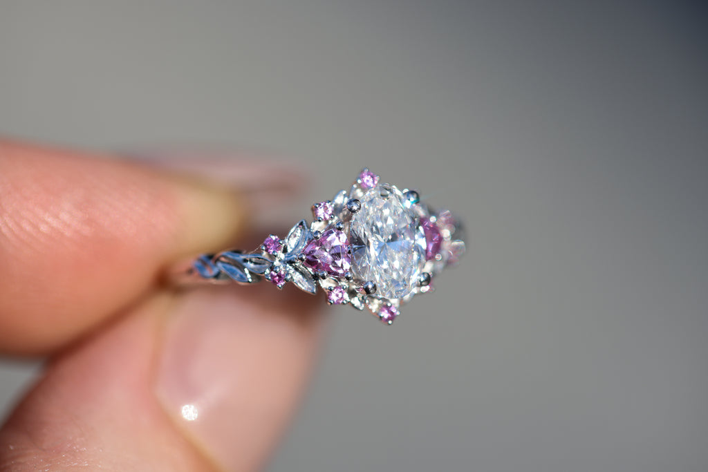Briar rose three stone with 7x5mm oval lab diamond center and pink sapphires