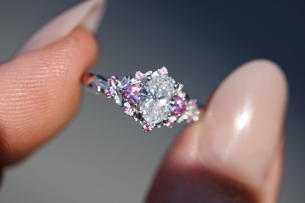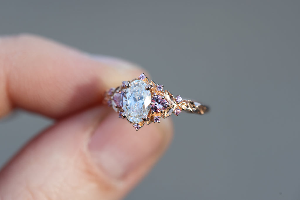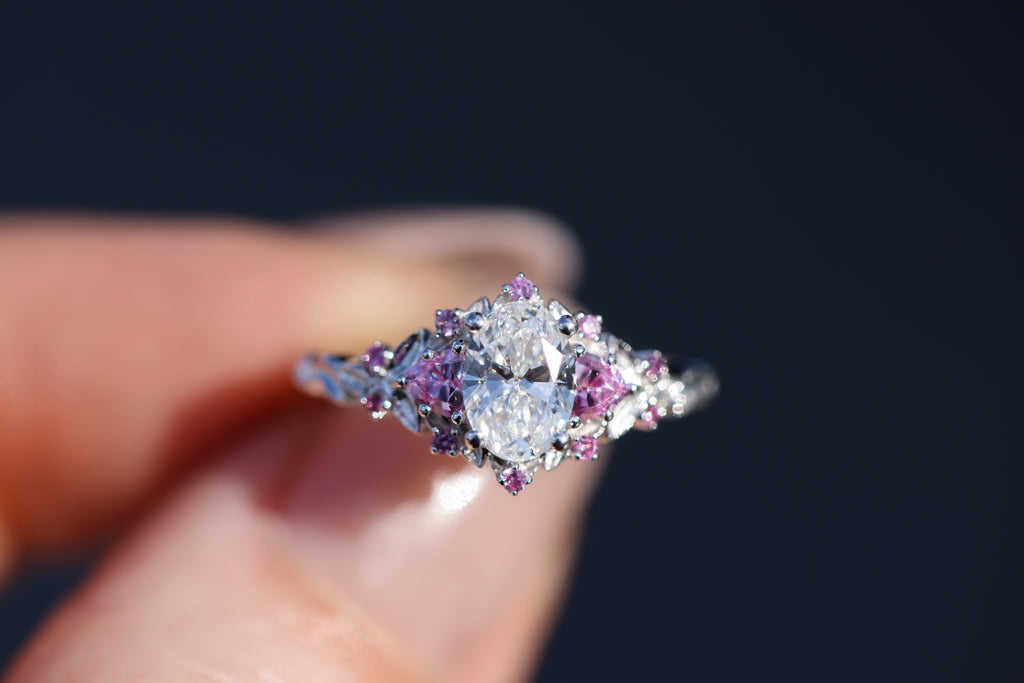 - 7x5mm oval lab diamond center (DEF color, VS2 or better)