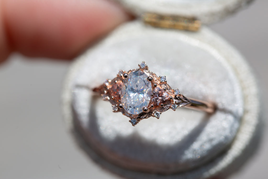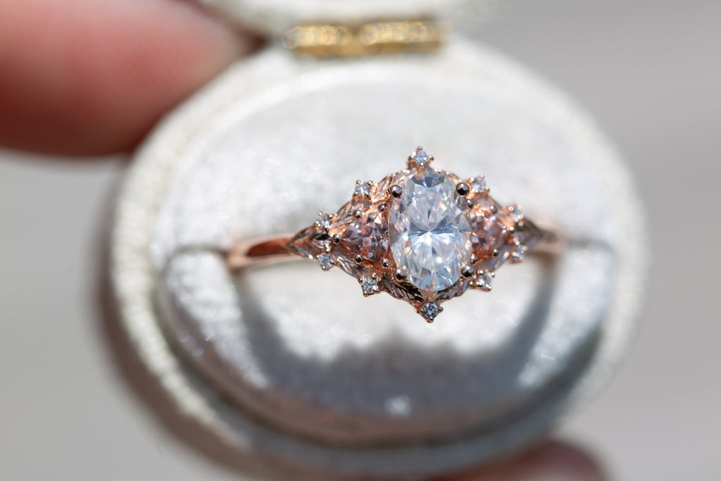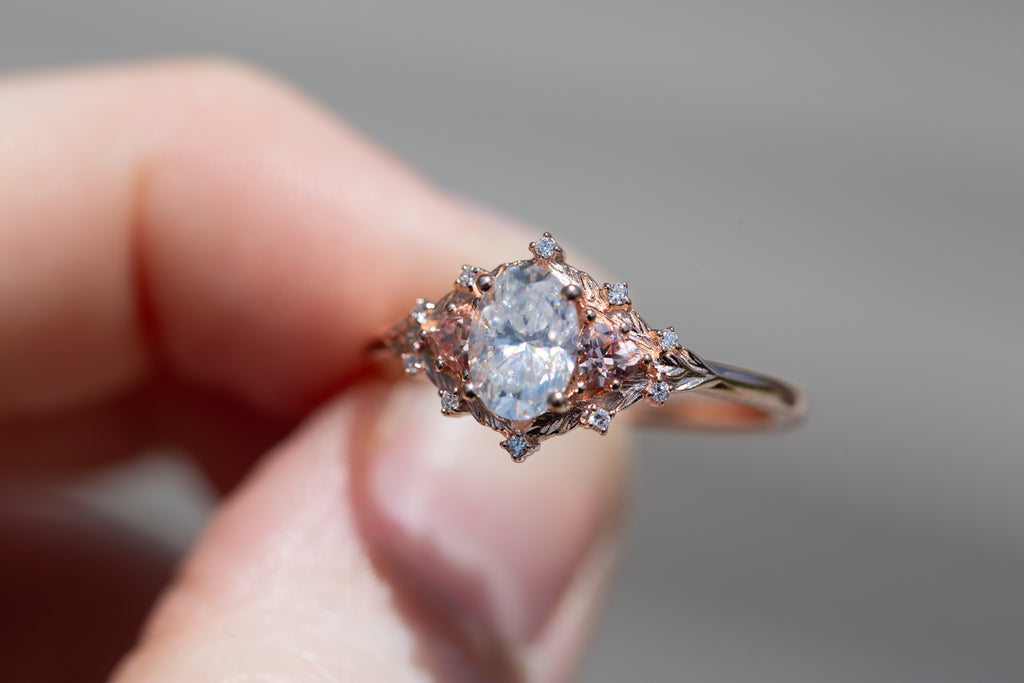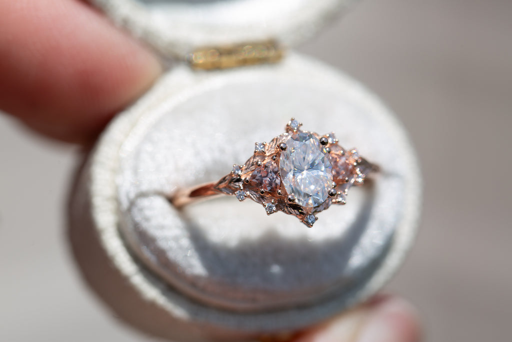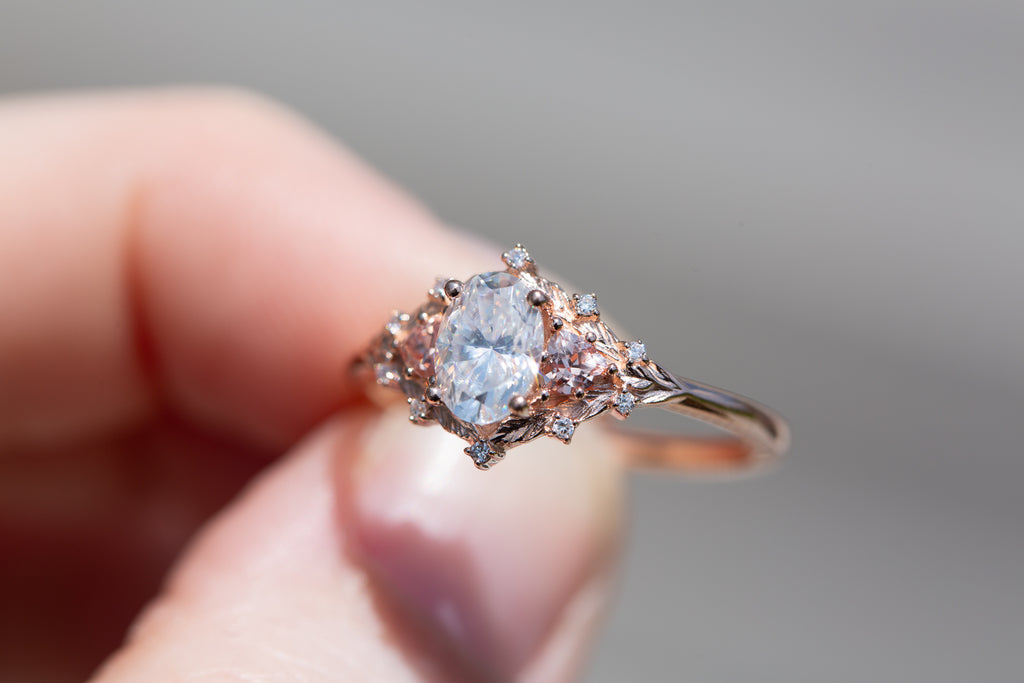 Woodland three stone setting with oval 7x5mm moissanite and lab peach sapphire sides
