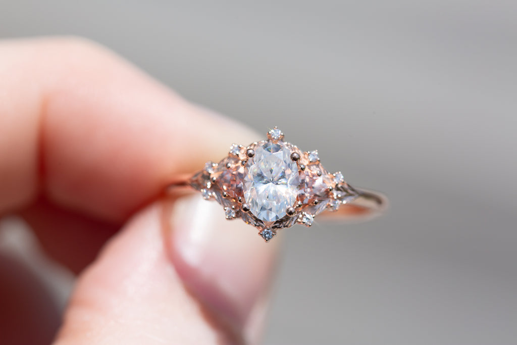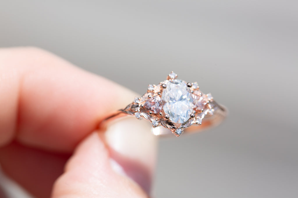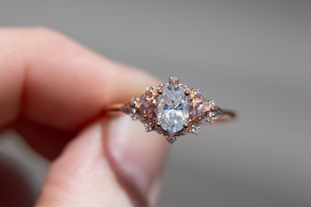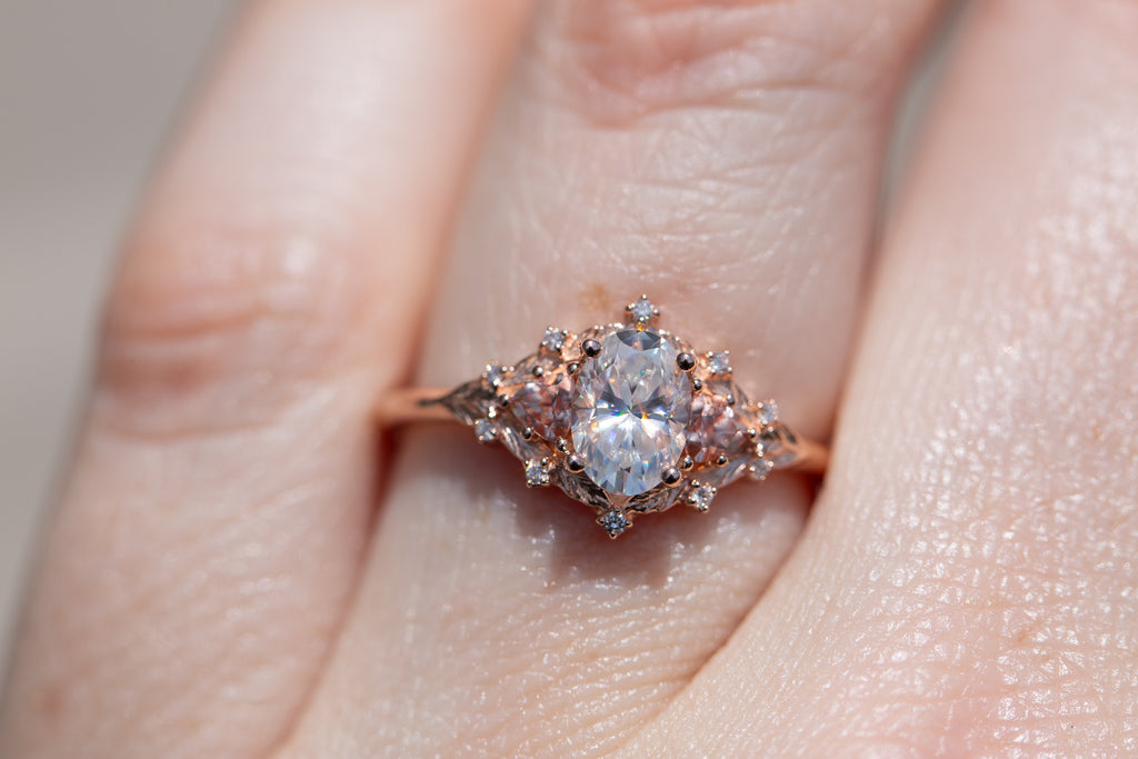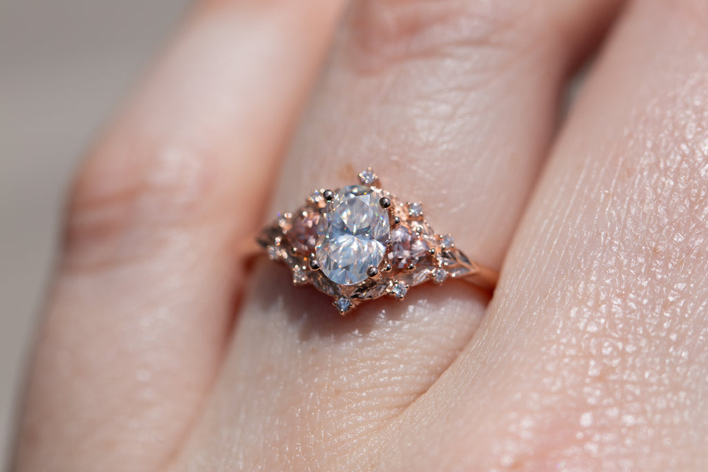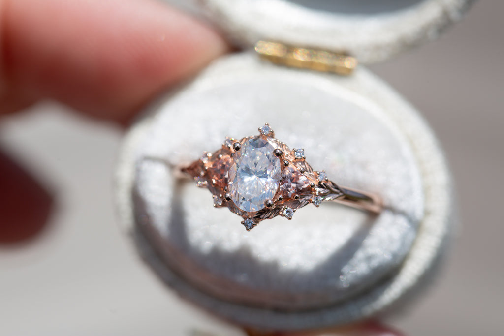 Woodland three stone setting with oval 7x5mm moissanite and lab peach sapphire sides