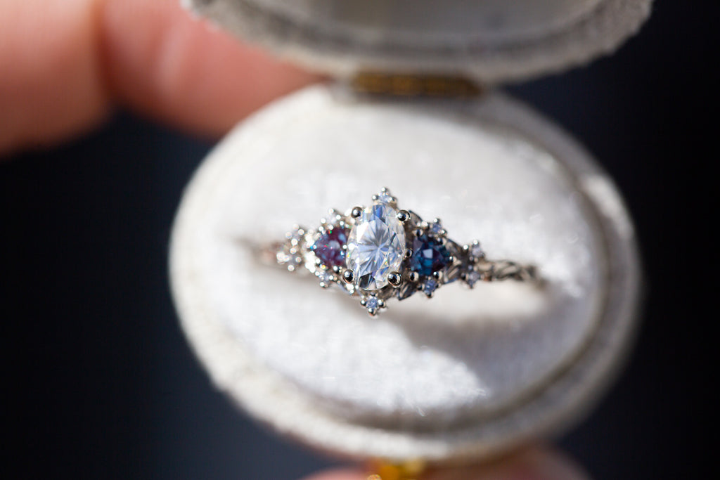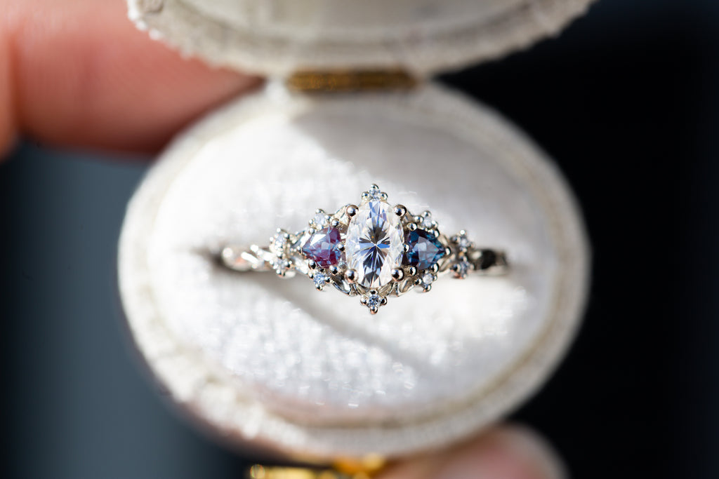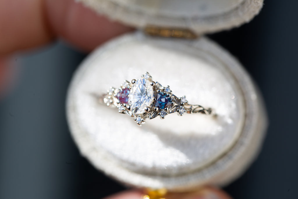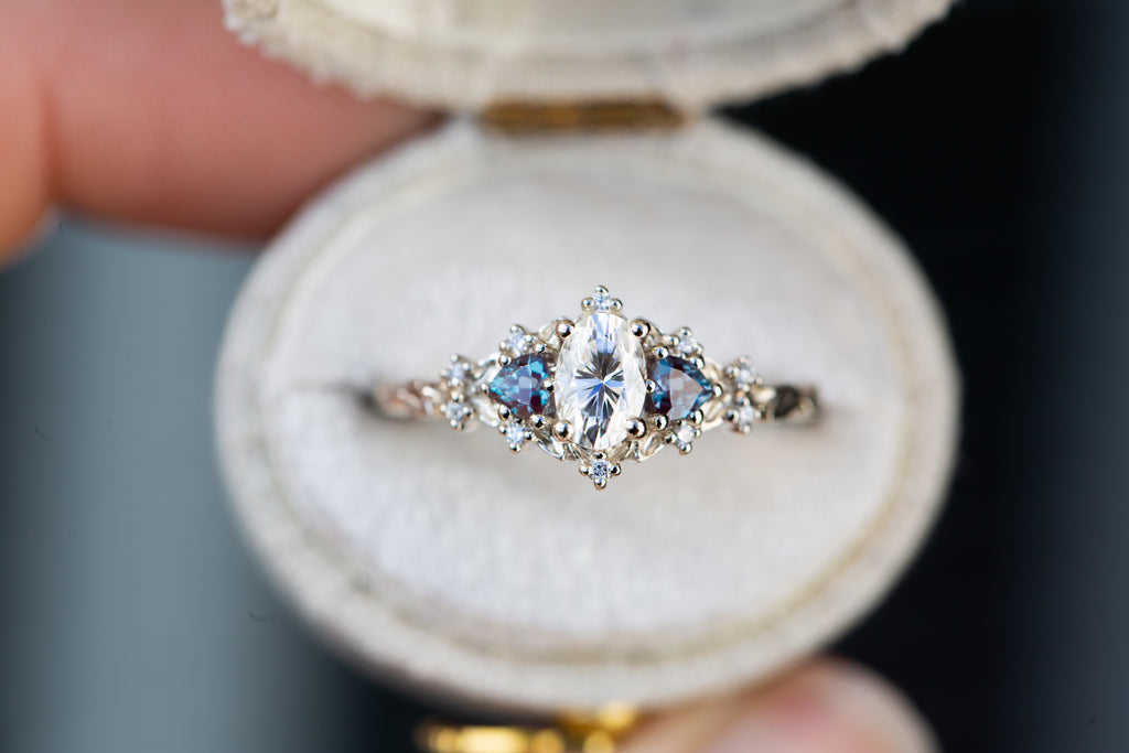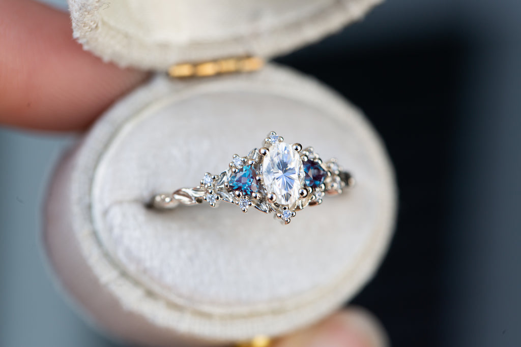Briar Rose Three Stone with 6x4mm oval moissanite and alexandrite
