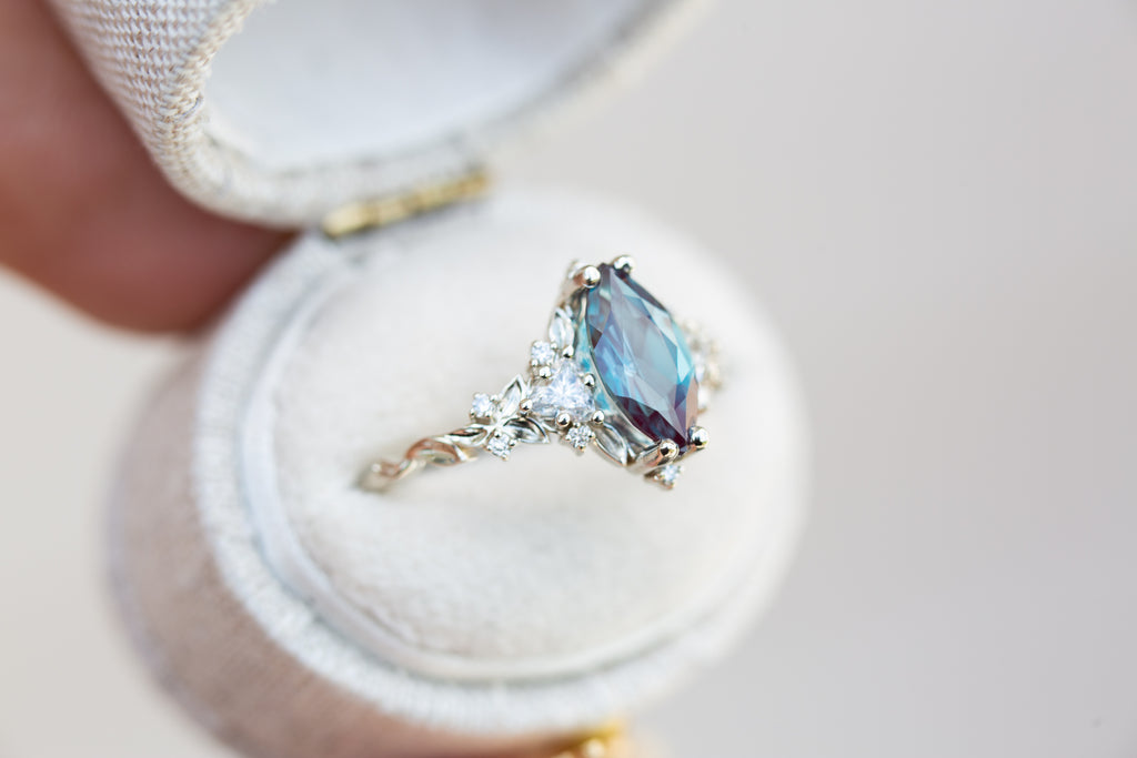 - *Please note that Alexandrite is a color changing stone that will mostly be a purple to green gem! You will also get some blue coloring and reddish purple in certain lighting but the blue you see in photos is actually green/teal in person! That is the nature of Alexandrite, there is no blue Alexandrite. Since this is such a unique stone we always recommend seeing in in person if you are able to!