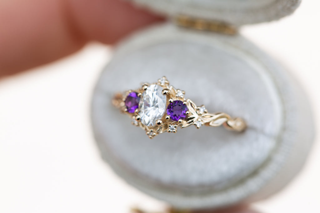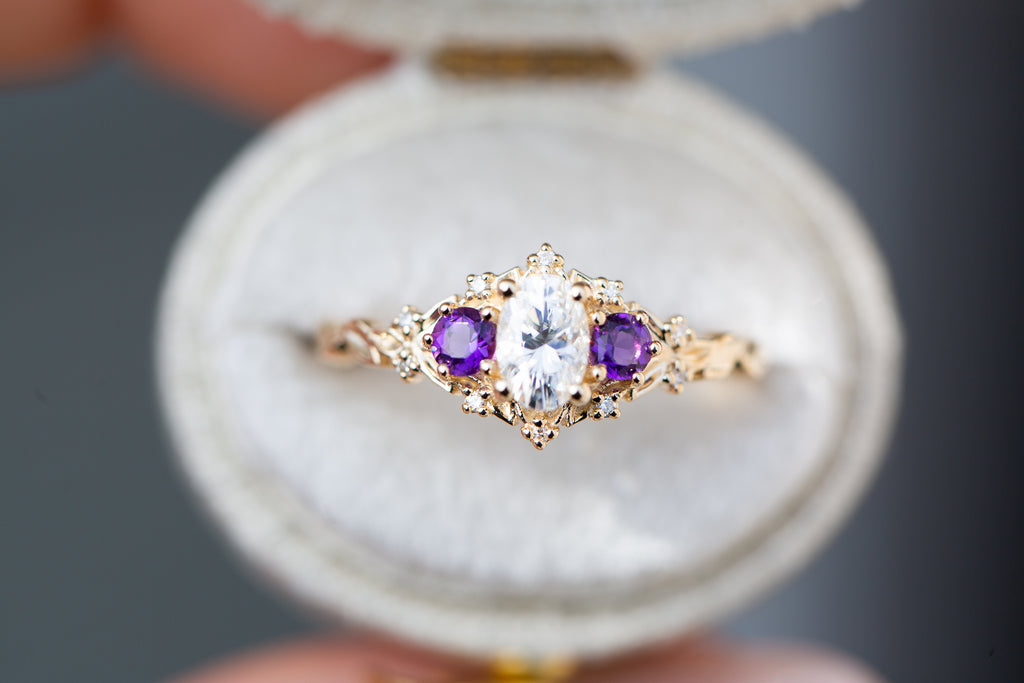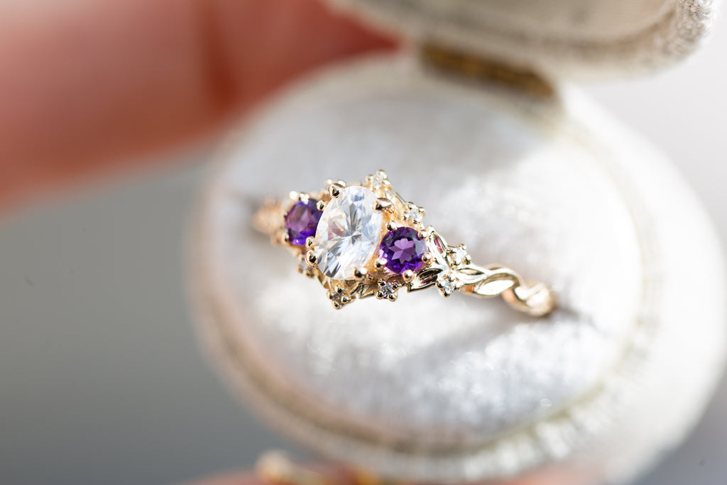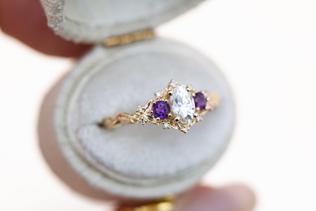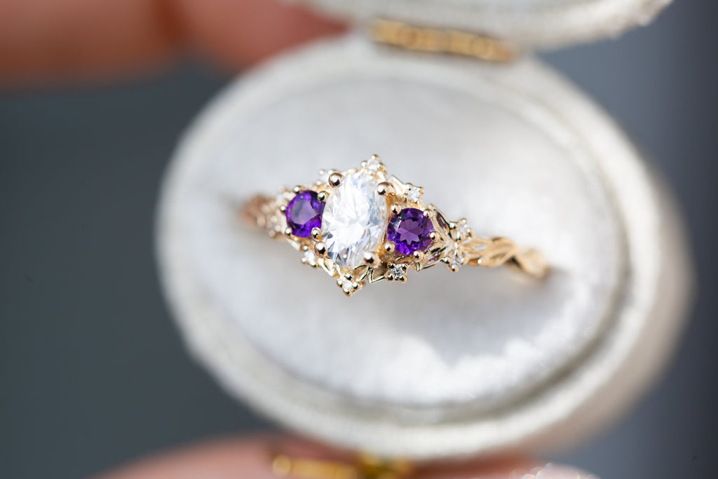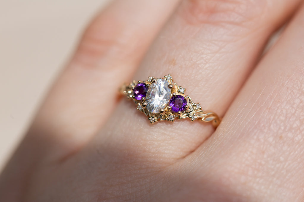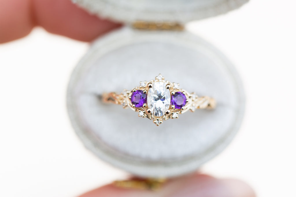 Briar Rose Three Stone with oval moissanite and round amethyst side stones (fairy queen)