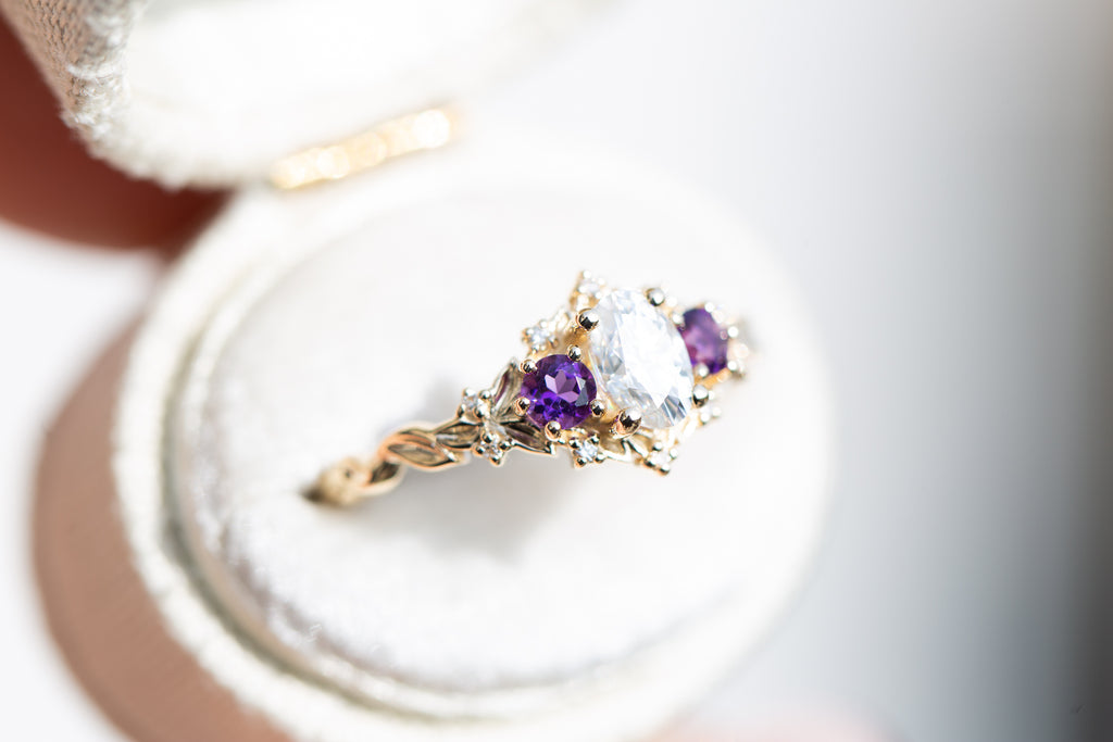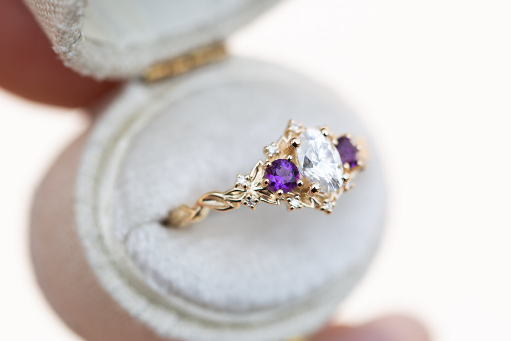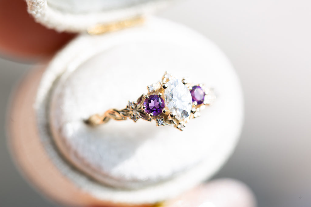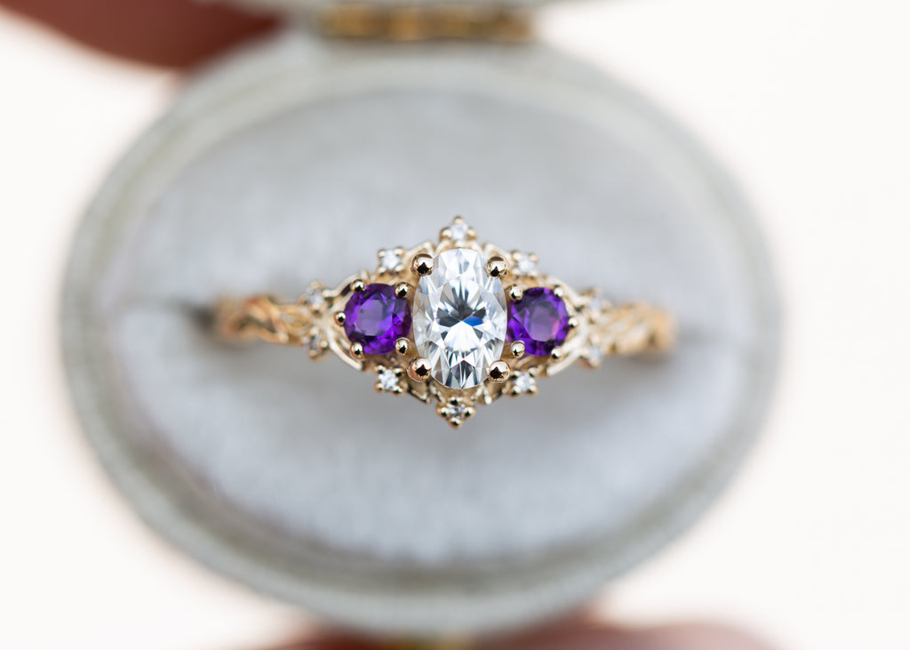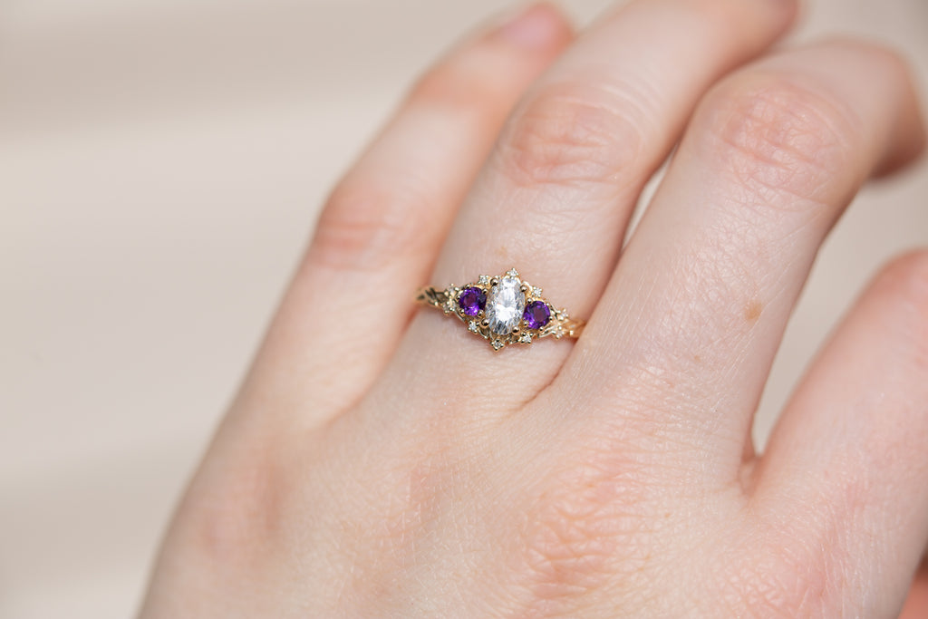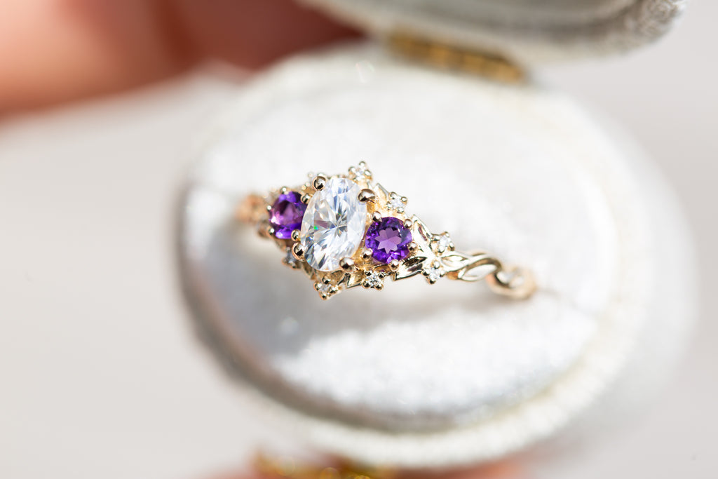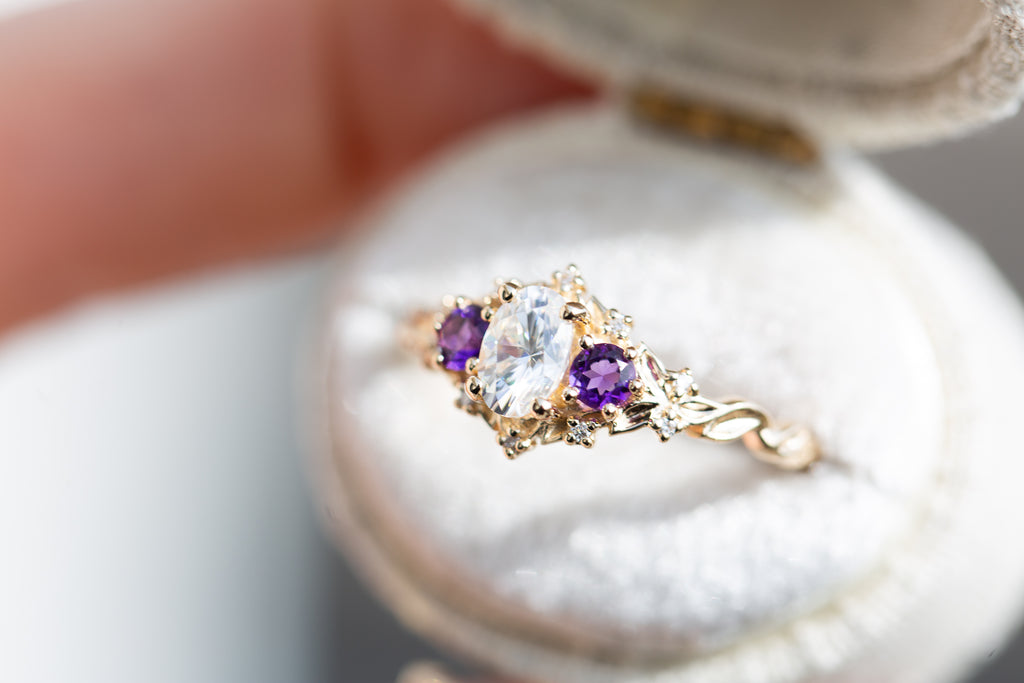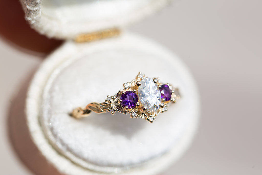 Briar Rose Three Stone with oval moissanite and round amethyst side stones (fairy queen)