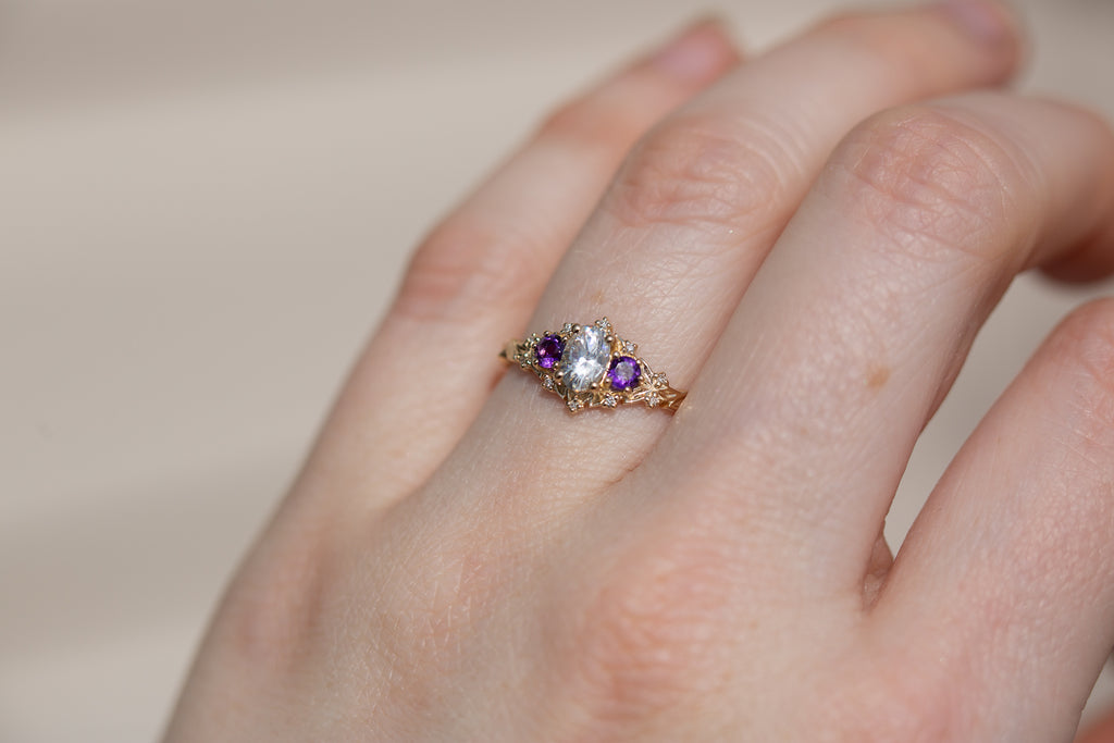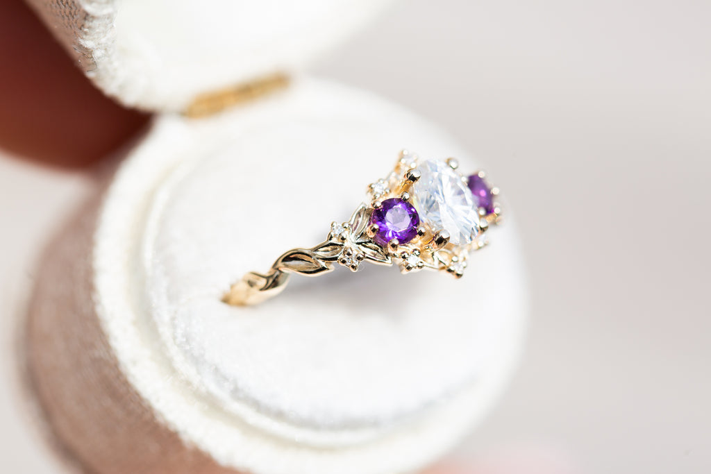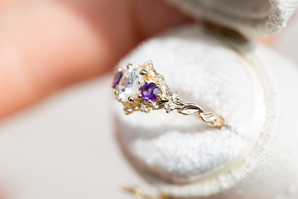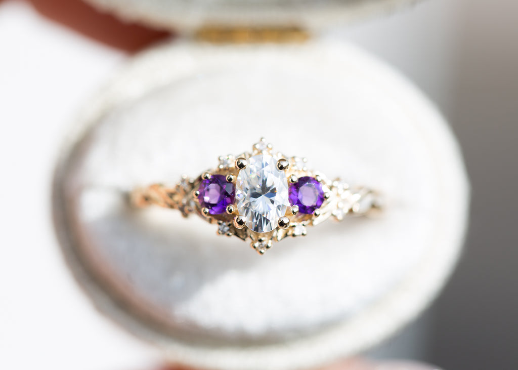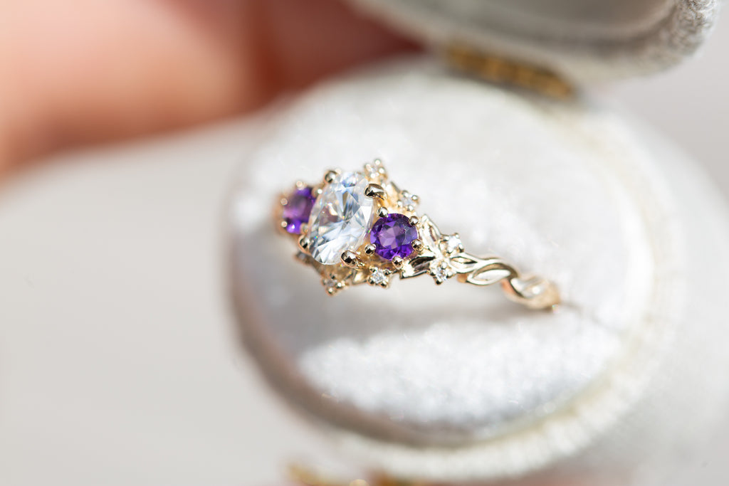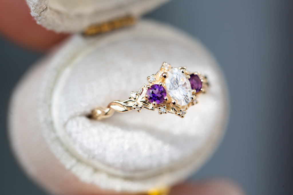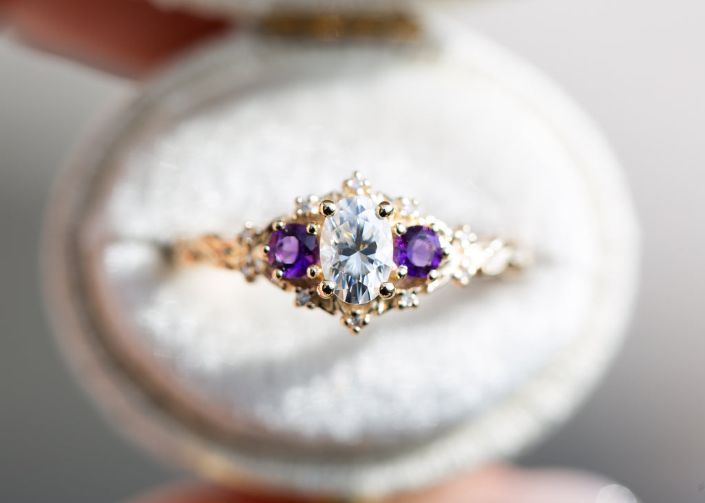 Briar Rose Three Stone with oval moissanite and round amethyst side stones (fairy queen)