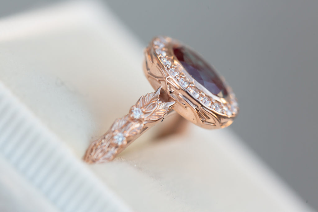 - Small leaves are woven together on each side of the ring, with small bramble type of thorns wrapping around the center stone and slightly down the sides after the leaves.